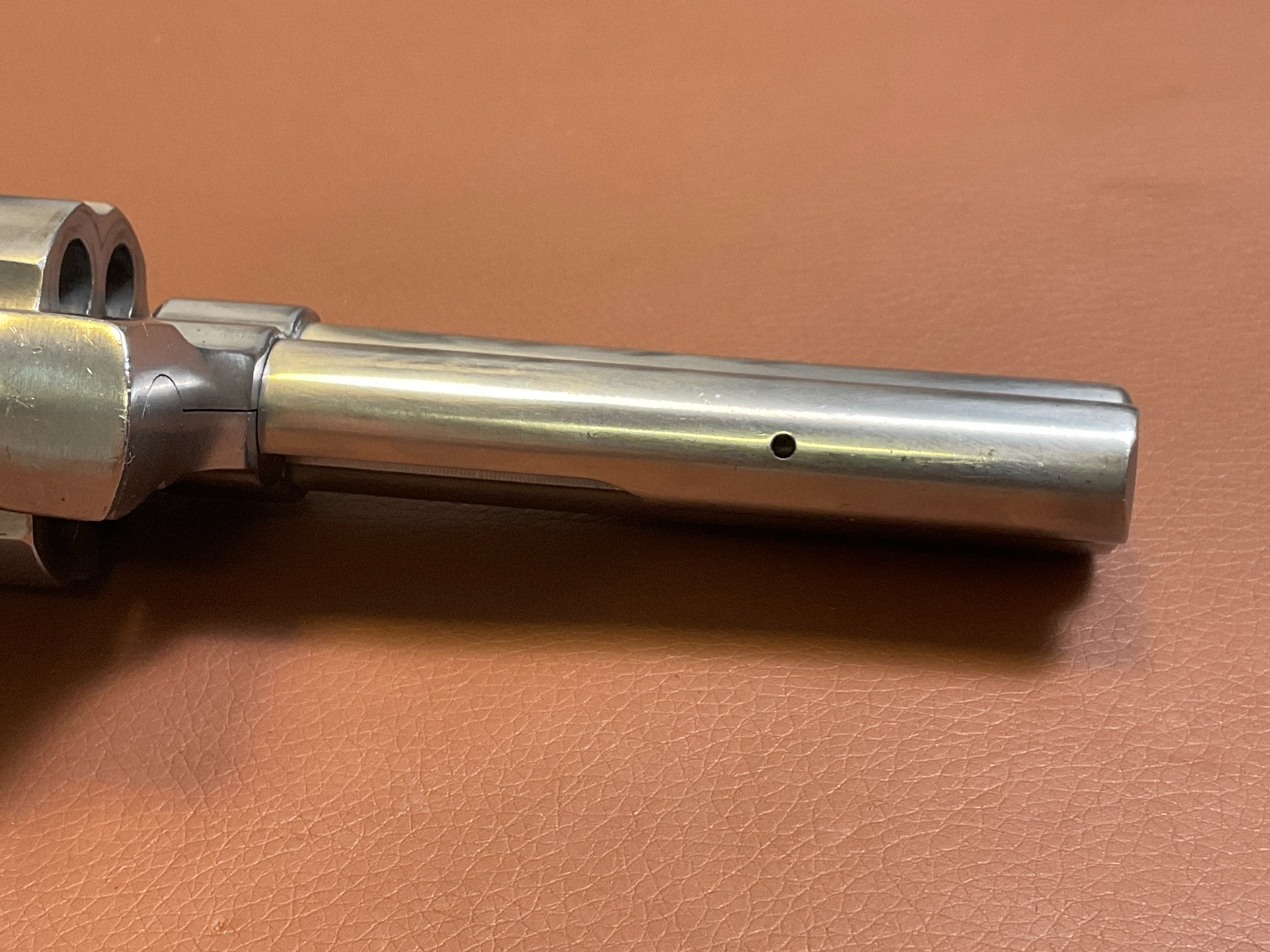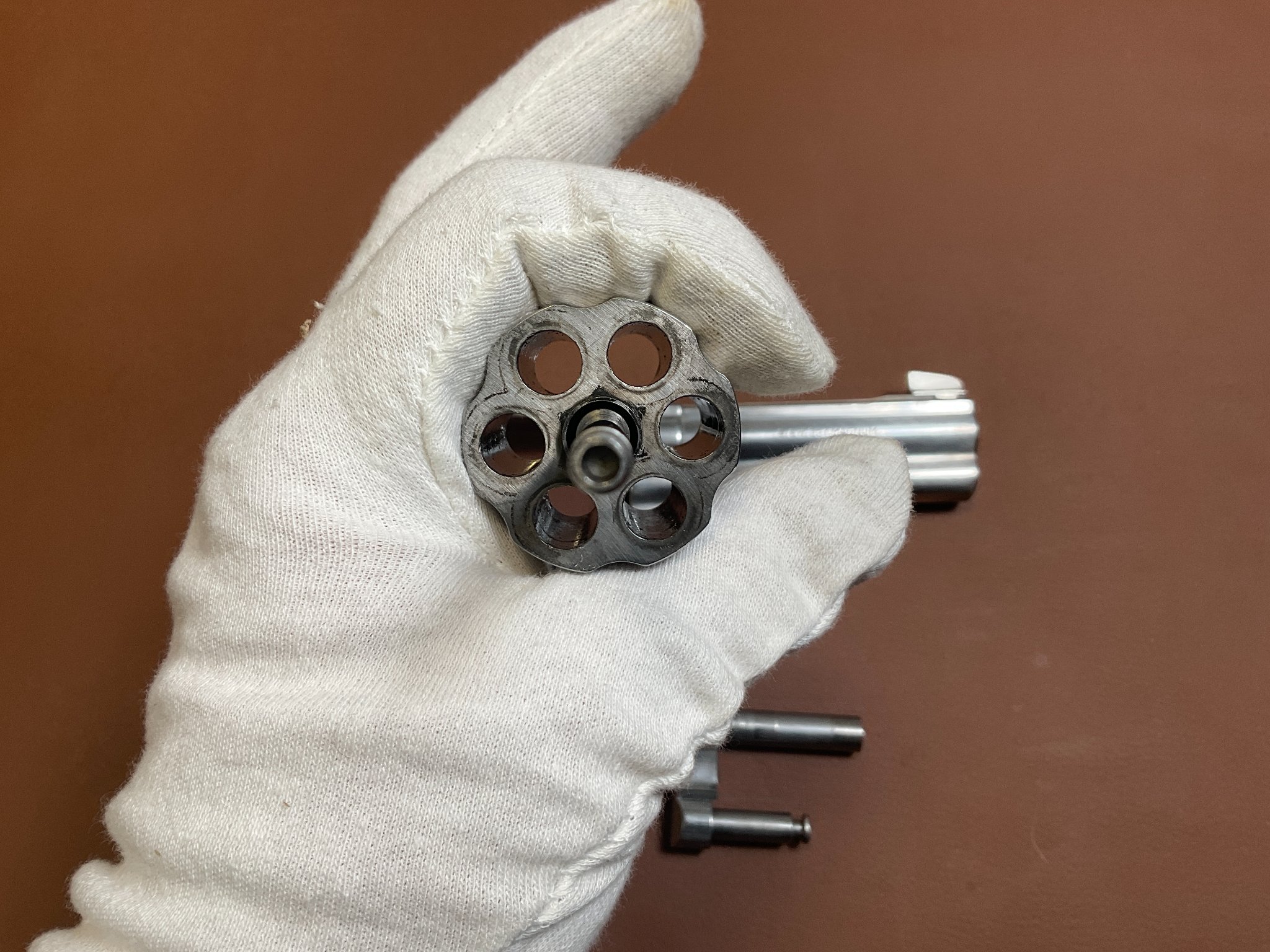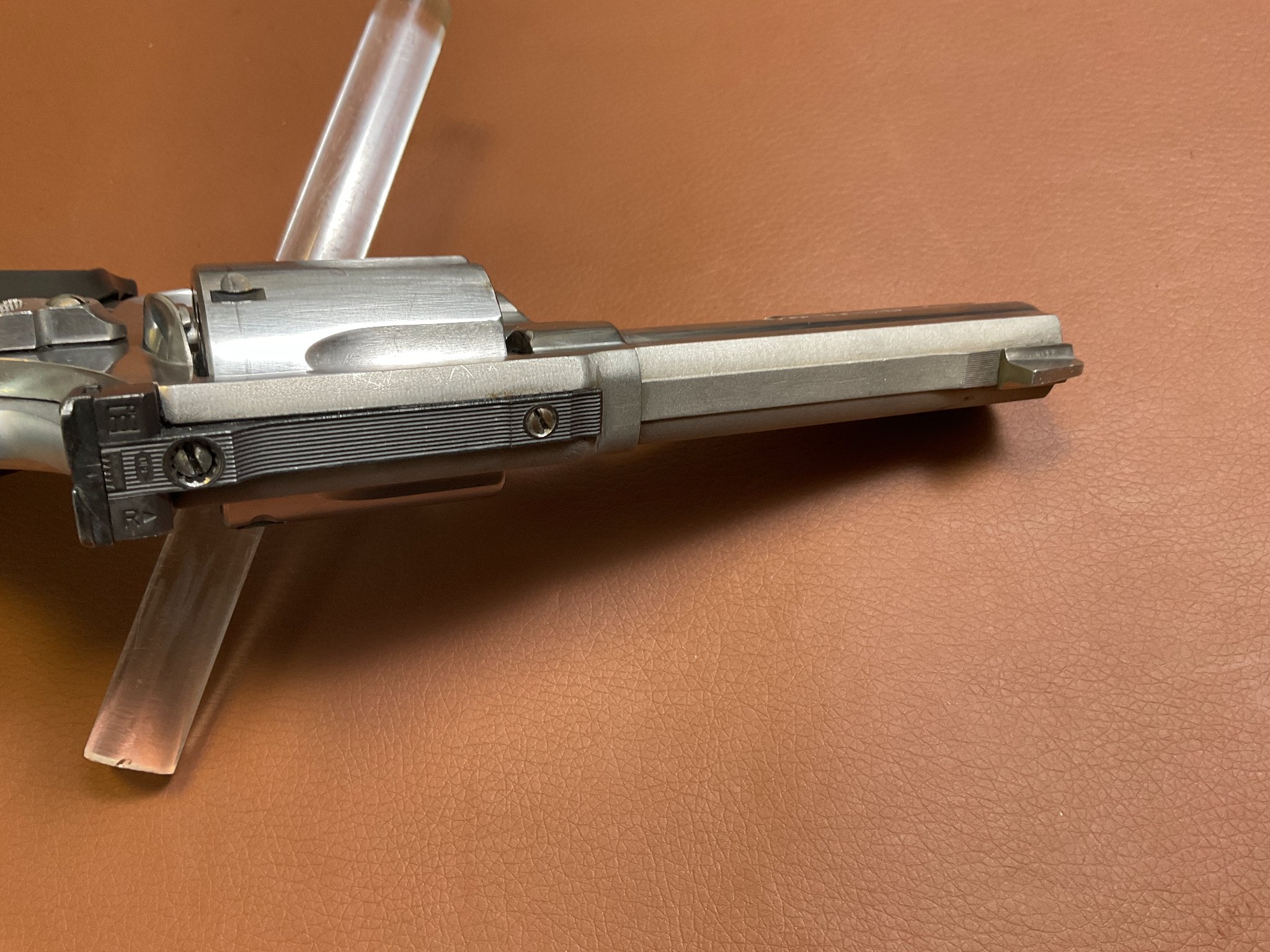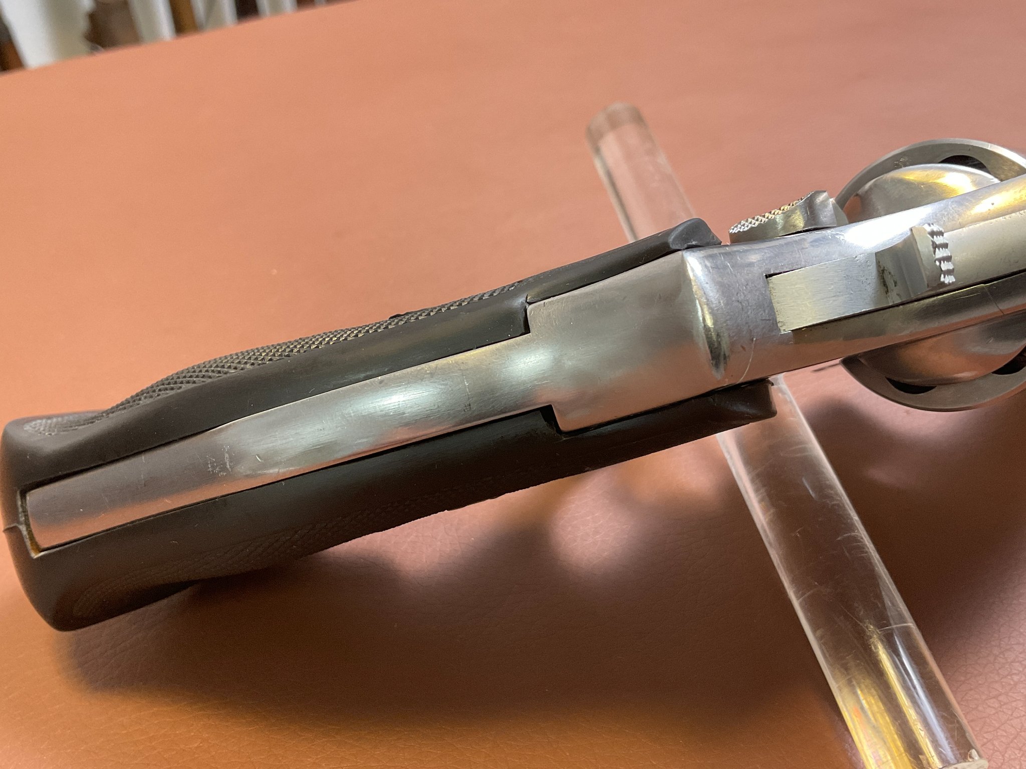 Unter der rechten Griffschale befindet sich eine Gravur des Vorbesitzers. Der Revolver weist leichte, altersbedingte Gebrauchsspuren auf, befindet sich jedoch insgesamt in einem guten Zustand.