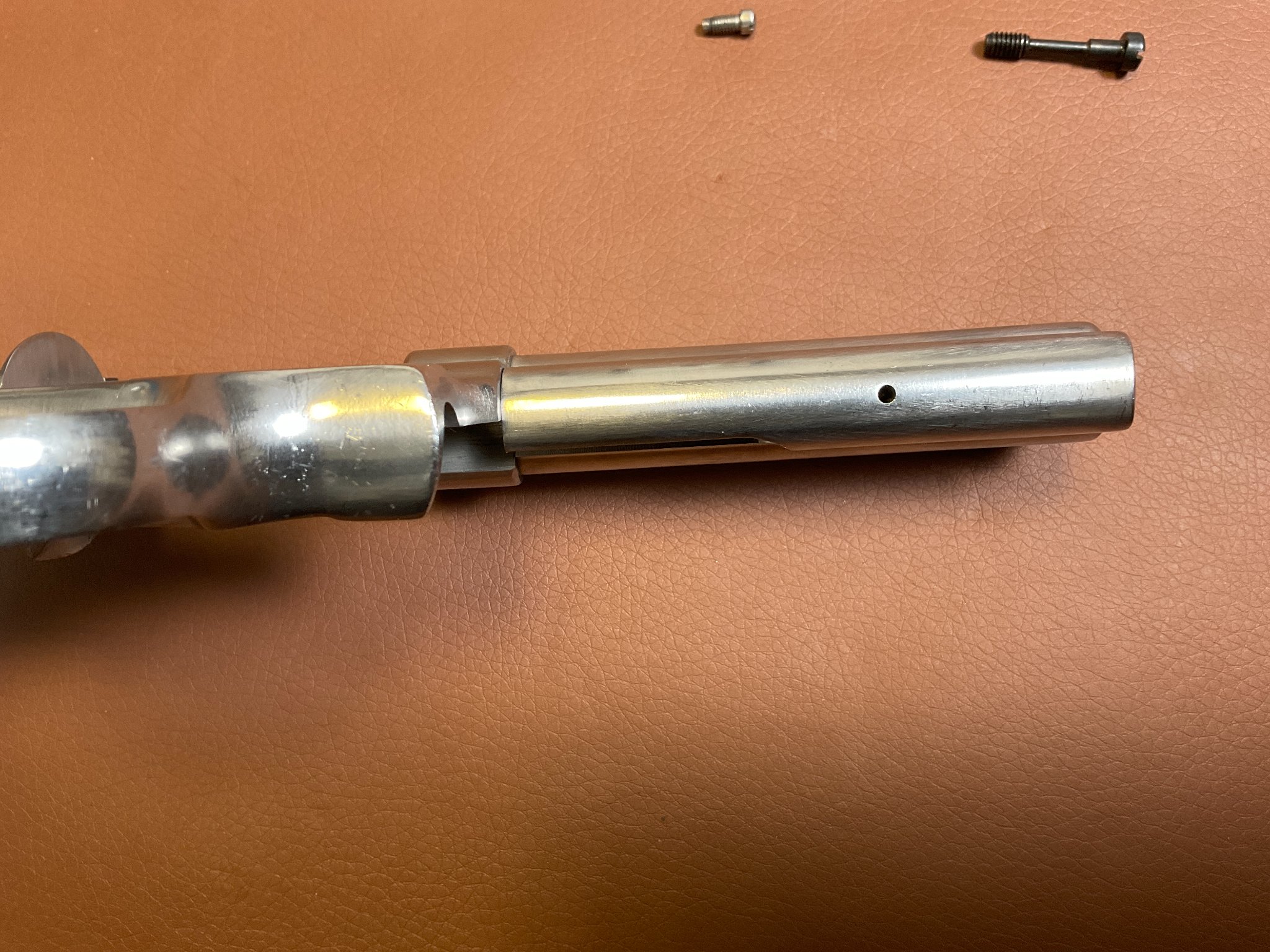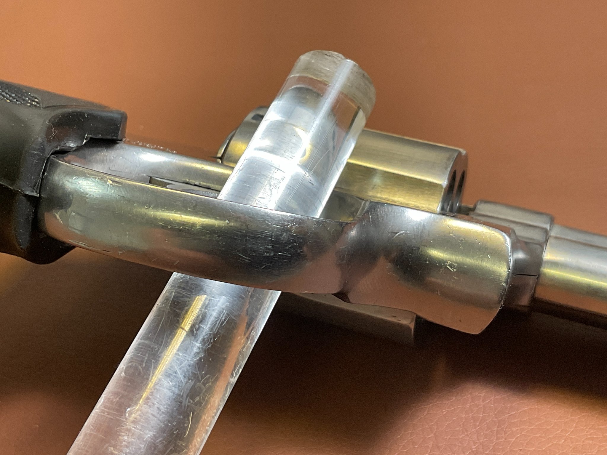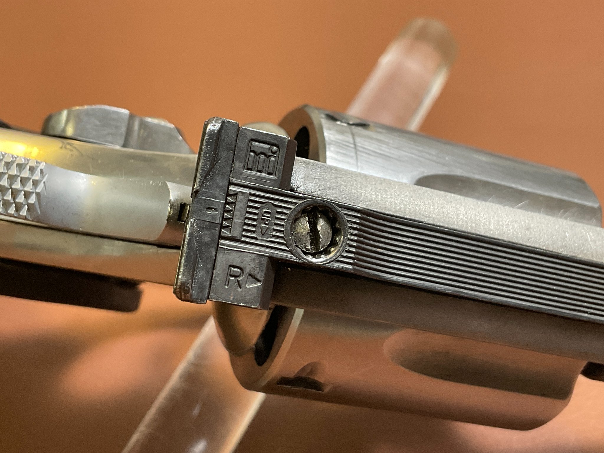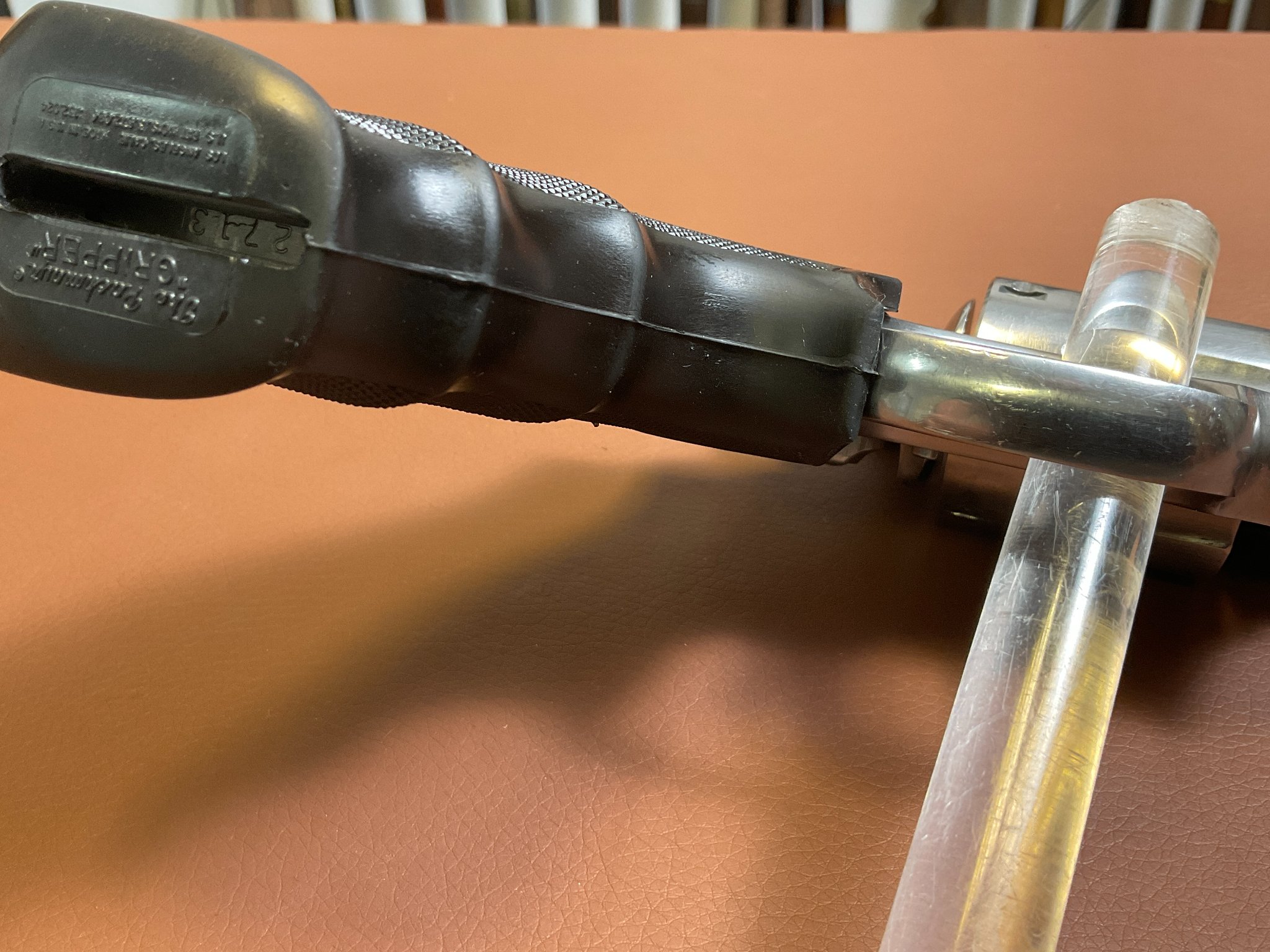 Unter der rechten Griffschale befindet sich eine Gravur des Vorbesitzers. Der Revolver weist leichte, altersbedingte Gebrauchsspuren auf, befindet sich jedoch insgesamt in einem guten Zustand.