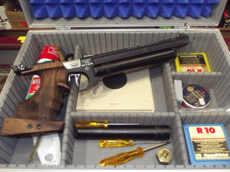 Zur Auktion kommt eine STYER MANNLICHER CO2 Luftpistole im Kaliber 4,5 mit reichlich Zubehör in einem Alu-Pistolenkoffer,- die Waffe befindet sich ein eimem gepflegten Bestzustand / Siehe Bilder