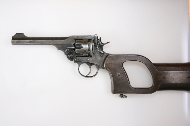 Nummerngleicher Nussholz-Anschlagschaft (9723) mit einer in Griffform durchbrochenen, patinierten Stahlplatte. Rechts fixiert durch eine verschraubte, bronzene Griffschale. Zwei Riemenbügel. Gute, originale Gesamterhaltung. Der Anschlagschaft stammt von der Signalpistole Webley No. 1 Mark I, deren Griff identisch ist mit dem der Mark VI-Revolver. Äußerst seltene Variante des Webley Mark VI.