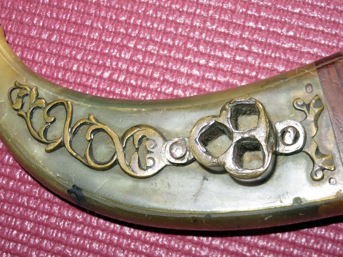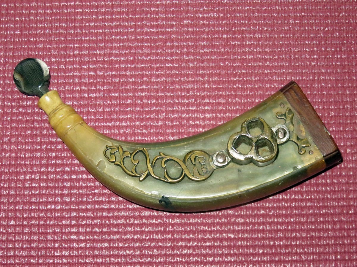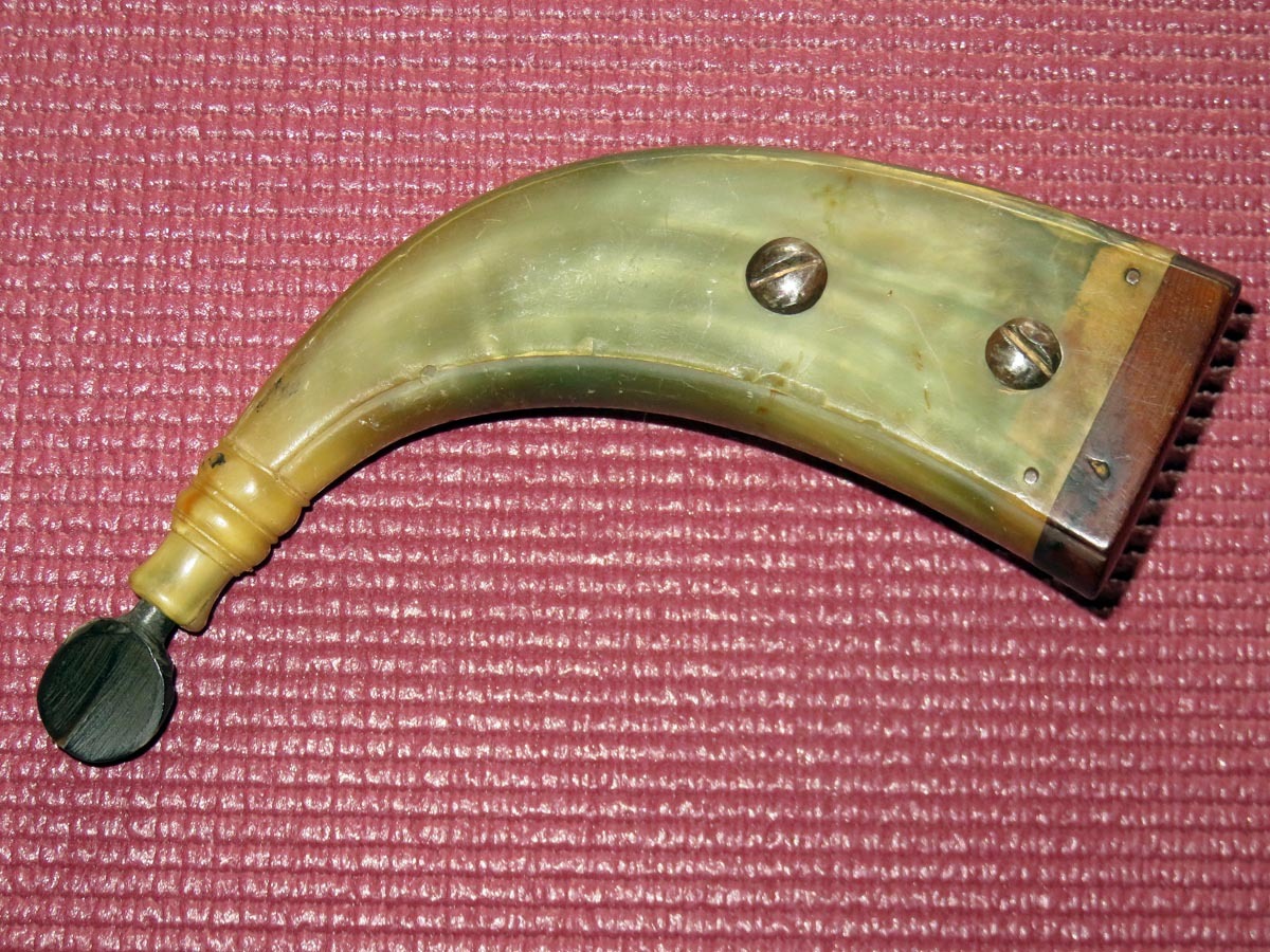 Das aus Kuhhorn flach gepresste Pulverbehältnis hat einen aus Messing gefertigten, 3-fachen verzierten Vierkantschlüssel zum Spannen des Radschlosses.
