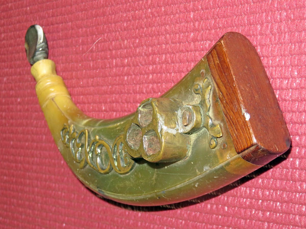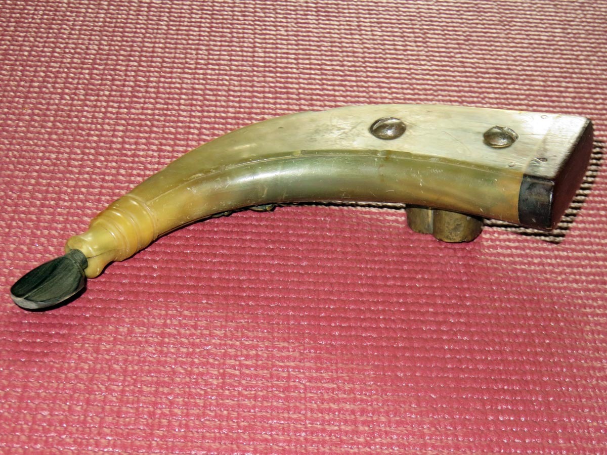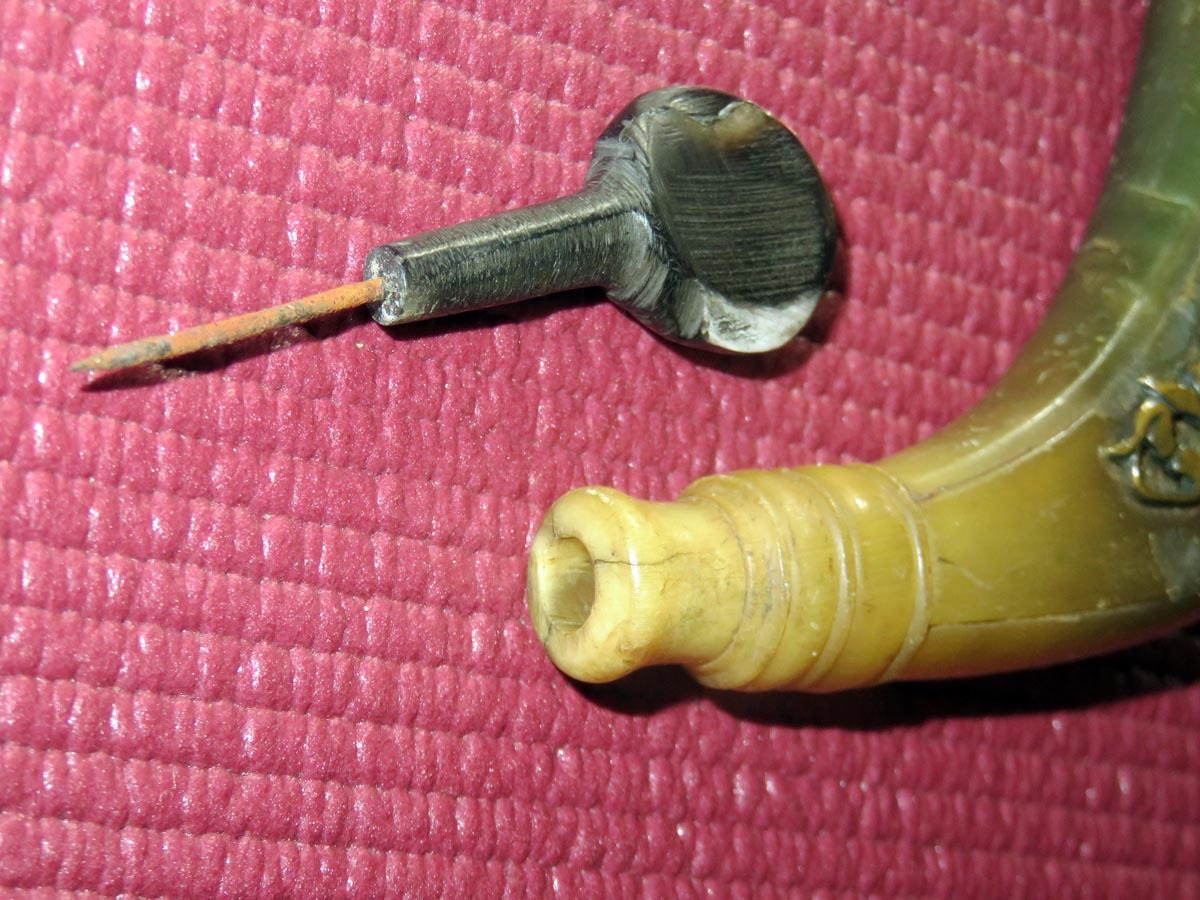 Das aus Kuhhorn flach gepresste Pulverbehältnis hat einen aus Messing gefertigten, 3-fachen verzierten Vierkantschlüssel zum Spannen des Radschlosses.