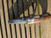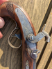 Ich biete einen handlichen Philadelphia Derringer der Firma C.O.M. Italy. Er hat die Seriennummer 1406. Der Laufhaltekeil tut was er soll, der Hahn hält sicher in zwei Rasten bei angenehmer Funktion des aufwendig gefertigten Schlosses. Die Kimme fehlt. Fischhautgriff. Die Namensplatte, die Schlosshalteplatte, die Bleche unter den Laufhaltekeilen und das unter dem Piston sind punziert 800, folglich Silber.
