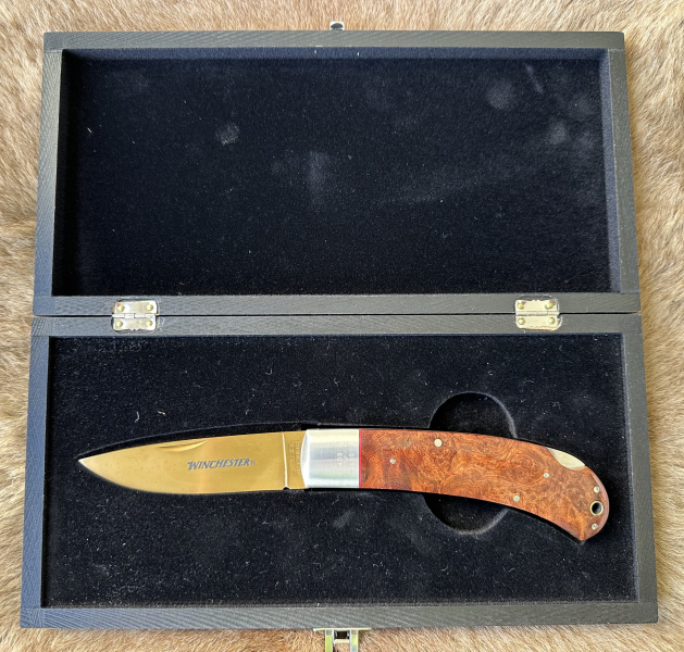 -------WICHTIG --- Bei Fragen oder wenn weitere Fotos benötigt werden bitte an t.tendera@web.de schreiben ------ Ich biete euch hier aus meiner Sammlung ein schönes unbenutztes Winchester Jubiläumsmesser, P 137 Klappmesser mit 97mm langer, gelb titannitrierter Klinge. Griffschalen aus Bruyèreholz, Backen aus Neusilber. In schwarzer Holzschatulle, S/N 403 von 600
