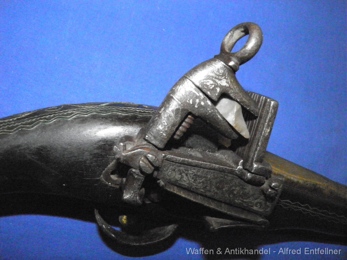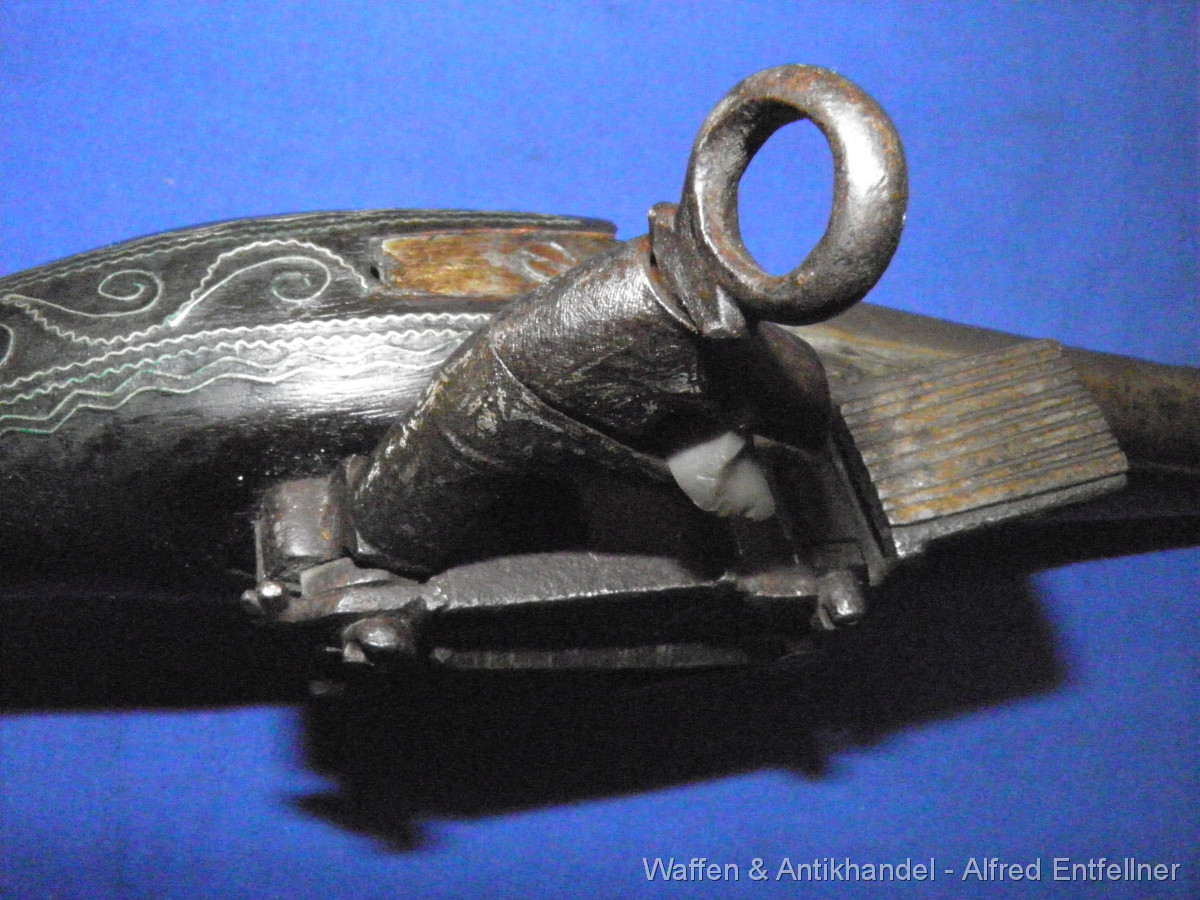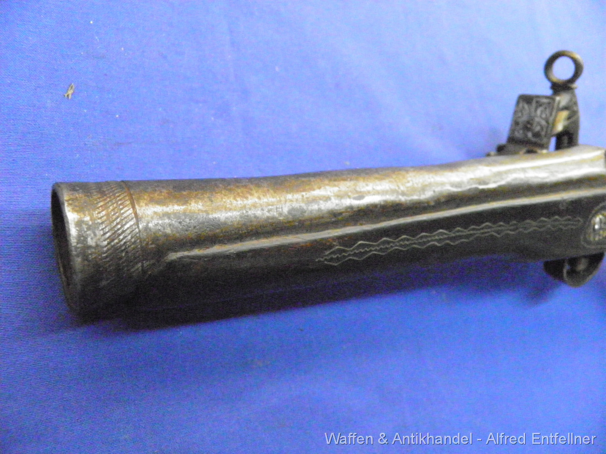 Uralte Vorderladerpistole mit Miquelett Hahnschloss. Ausführung Blunderbuss Mündung weite bei 25 m/m