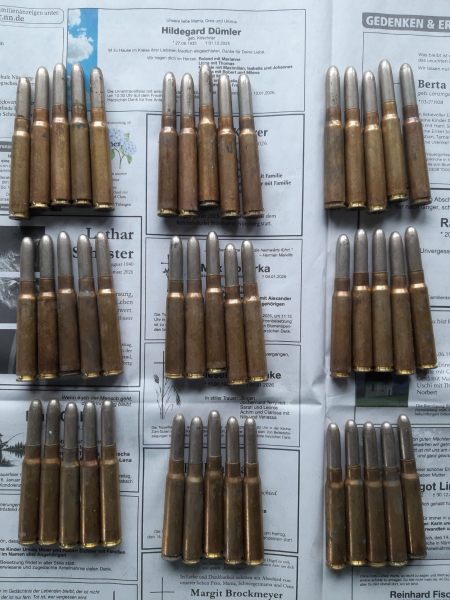 45 Patronen 88, 8x57I, deutsche Militärfertigung, Messinghülsen, Vollmantel Rundkopf vernickelt, Bleikerne, verschiedene Bodenstempel, Dachbodenfund, keine Funktionsgarantie, Zustand vgl. Bild.