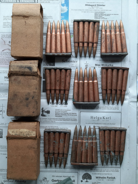 45 S-Patronen, 8x57IS, deutsche Militärfertigung, verkupferte Stahlhülsen, Vollmantel Spitzgeschoss verkupfert, Bleikerne, alle mit Bodenstempel SE/PMF (als Logo)/10/18, alle auf Ladestreifen, originale Umverpackung, zwei Verpackungen mit Etikett: Fertigung 291018, Dachbodenfund, keine Funktionsgarantie, Zustand vgl. Bild.