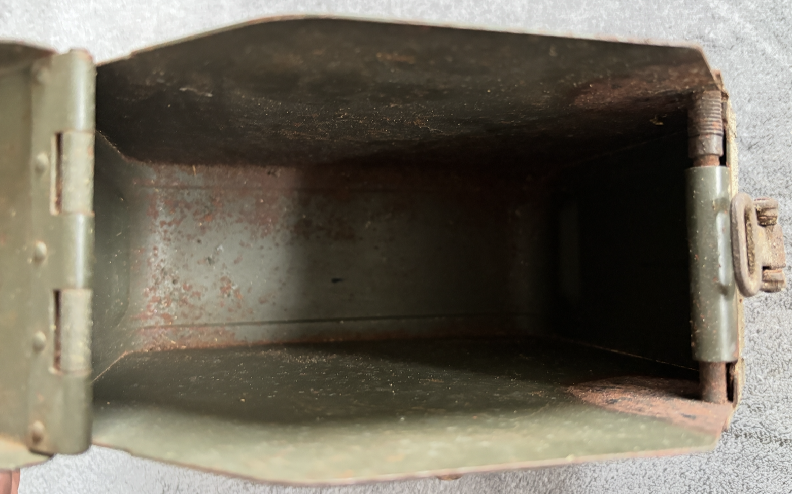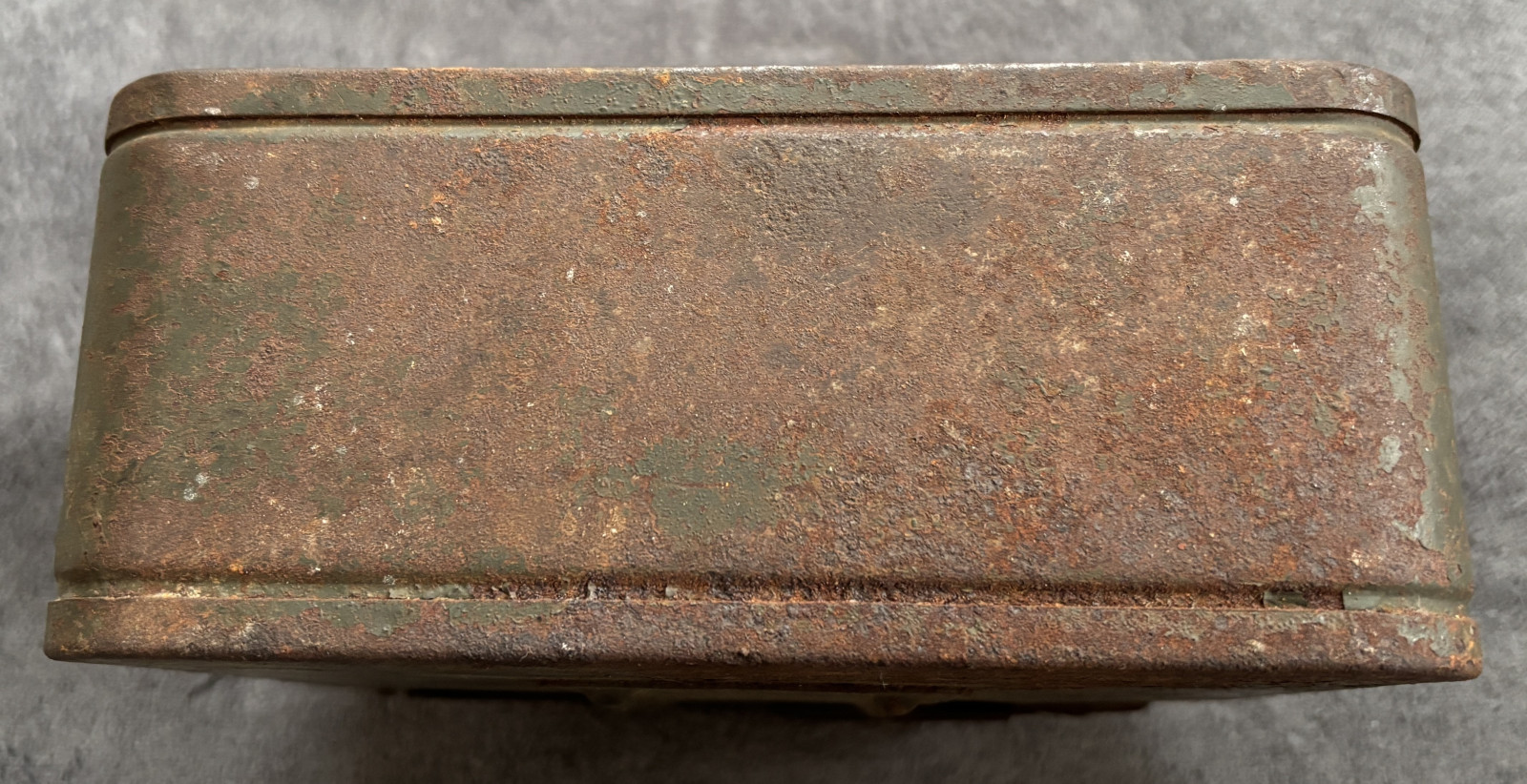 Der Kasten befindet sich im Originalen Fundzustand hat allerdings an manchen stellen Rost ( siehe Fotos )