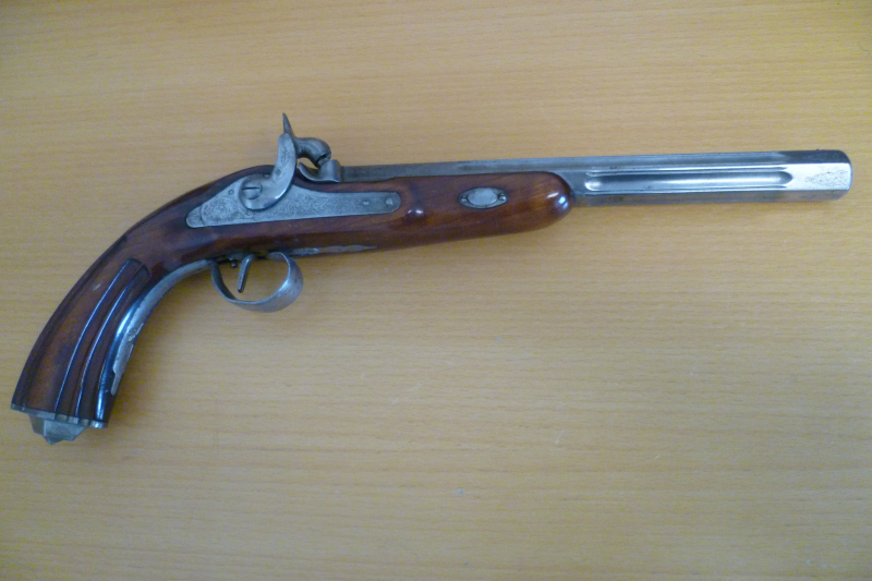 Voderlader-Perkussionspistole mit Gebrauchs- und Altersspuren.