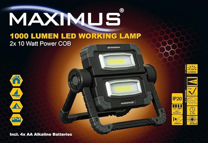 LED Arbeitsleuchte 2 x 10 W, 1000 Lumen, 200x230x50mm inklusive Batterien 4 x AA/R6 Alkaline, individuell drehbar und anschaltbar, im Fotokarton, UVP 24,95 €