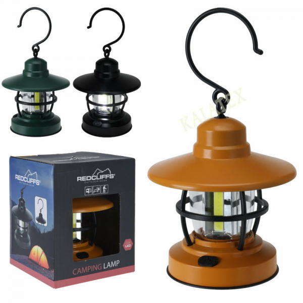 Campinglampe Ø 10,5 x Höhe: 12,5 cm mit COB und Haken, 4-fach sortiert, batterienbetrieben 3x AAA/R3, Batterien nicht im Lieferumfang enthalten, aus Polypropylen, im Fotosichtkarton (11 x 14 x 11 cm)