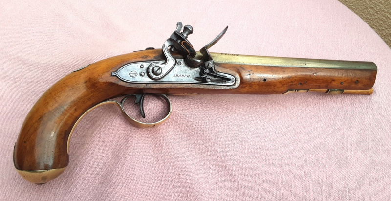 This London Gun maker "SHARPE" was in business from 1800 until 1840. Initially he contracted with the Hudson Bay Company to supply these good quality Flintlock pistols that were traded to the Indigenous Red Indians in exchange for FUR PELTS that were eagerly desired in the European Fashion Trade.