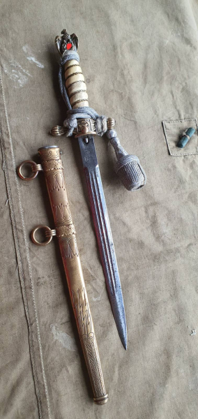 Kriegsmarine-Dolch, guter Zustand. Ausführung mit Stahlklinge und Herstellerkennzeichnung „Eichhorn“ (Eichhörnchen). Altersbedingte Gebrauchsspuren vorhanden, insgesamt jedoch ein ordentlicher und sammelwürdiger Zustand. Die Klinge weist eine altersentsprechende Patina auf. Griff, Parierstange und Scheide befinden sich in einem dem Alter entsprechenden Gesamtzustand.