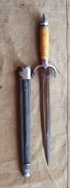 Der Dolch besitzt eine klassische Form mit beidseitig geschliffener Klinge aus gehärtetem Stahl. Auf der Klinge befindet sich ein Stempel mit einer römischen Zahl (X / 10). Der Griff ist aus Knochen oder Horn gefertigt und liegt gut in der Hand. Die Lederscheide ist erhalten und unbeschädigt.