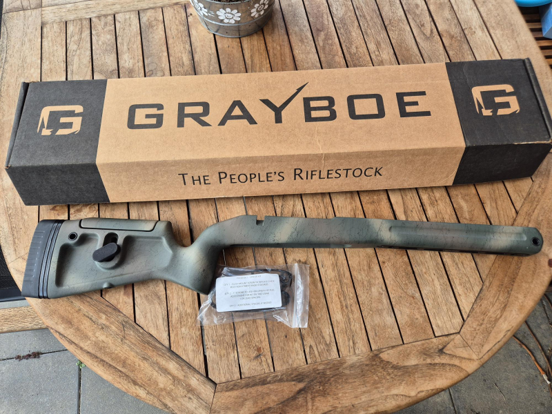 In Deutschland eigentlich nicht zu bekommen: Grayboe Phoenix 2 Schaft, für Rechtshänder, Farbe Woodland Camo, Short Action. Mit Höhenverstellung. Für Tikka CTR. Dürfte auch für andere Tikkas passen, dann müsste jedoch eine Magazinplatte wie z.B. von Atlasworx mit AICS-Magazinen genutzt werden. 1 M-Lok Rail vorne, insgesamt 7 QD-Sling Buchsen.