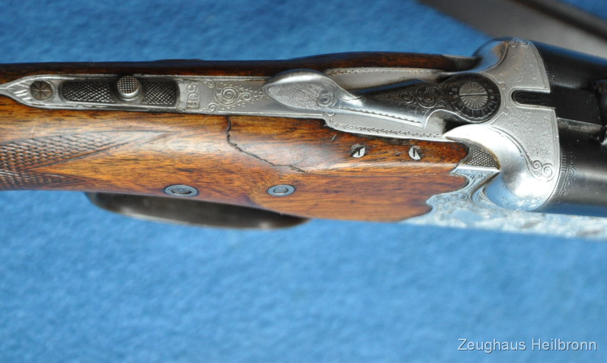 Waffe in einem leicht gebrauchten Zustand, Schaft hatte einen Riß, wurde repariert und ist fest, Drilling aus der Meisterwerkstatt Sodia in Ferlach, hochwertige Ausführung, Aluminium-Basküle.