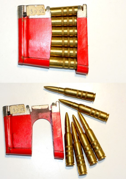6 Exerzierpatronen aus massivem Messing in zugehörigem rot lackiertem Laderahmen, für schweizer Infanteriegewehr Schmidt-Rubin 1889, sehr guter Zustand