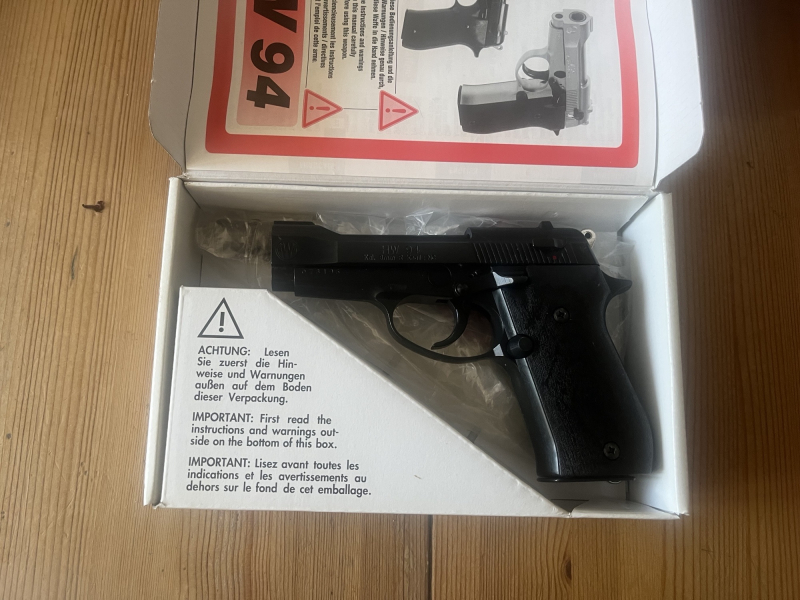 Verkauft (Auflösung meiner Sammlung) wird eine kaum genutzte Schreckschusspistole des Typs HW94 im Kaliber 9 mm R Knall, inklusive Originalverpackung und Zubehör. Der Zustand ist entsprechend sehr gut.