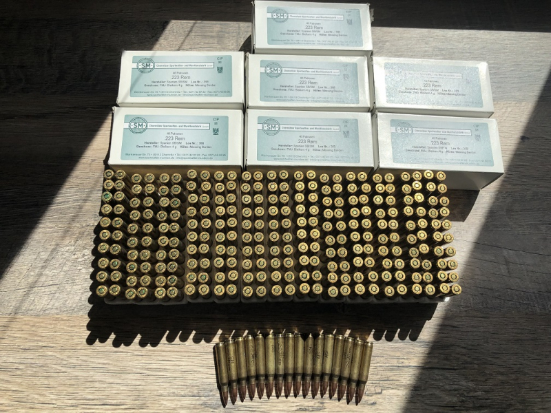 Verkaufe 276 Schuss .223 Remington von der Chemnitzer Munitionsfabrik, ursprünglich in Spanien gefertigt. Hatte ich sehr günstig von einem Bekannten gekauft welcher seine Munitionsbestände in diesem Kaliber aufgelöst hat, nun möchte ich diese ebenfalls wieder verkaufen. Es sind anscheinend umgelabelte 5,56er Hülsen (Munition hat laut verpackung trotzdem CIP), haben in meinem 223er Patronenlager zugeführt und auch alle gezündet.Siehe hierzu auch die Bilder.