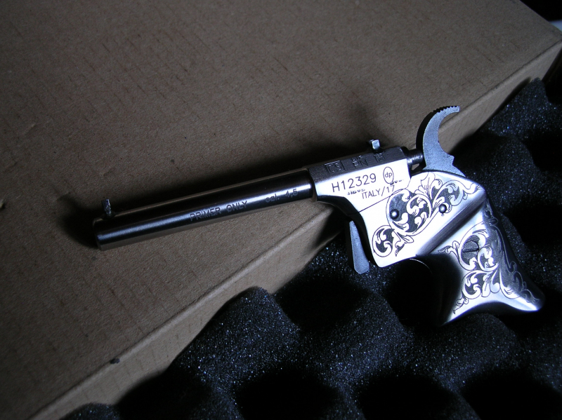 Ein Nachbau des sehr seltenen Remingten Rider Derringer, von dem nur etwa 200 Stück zwischen 1860 und 1863 gefertigt wurden. Solche kleine Pistolen wurden auch Salon Pistolen genannt, also für den Hausgebrauch.