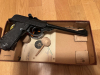 Zum Verkauf steht eine sehr gut erhaltene Walther Matchluftpistole Modell 53. Die Waffe wird verkauft in der Originalverpackung, Originalschussbild, Korne, Kimmenblätter, Werkzeug, etwas Munition. Lediglich der zum Spannen der Waffe erforderliche Holzknauf ist nicht dabei, dafür sind zwei nachgefertige Holz-Spannhilfen dabei. Die Waffe funktioniert tadellos, trotzdem schlöiesse ich auch bei dieser Privatauktion jede Gewähreleistung aus.