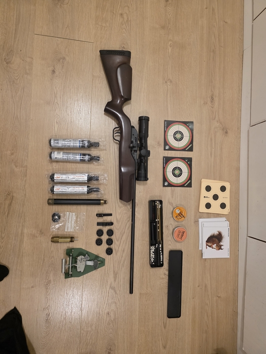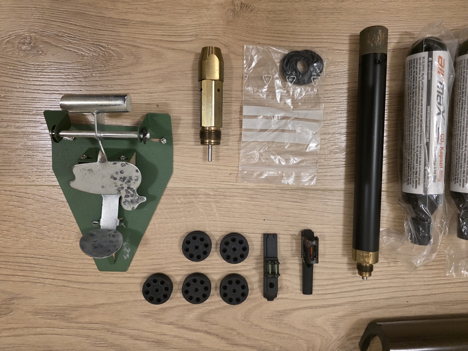 Es funktioniert einfandfrei und wird mit viel Zubehör verkauft. Mit dabei sind: - eine Kugelfangbox, in die man wahlweise eine Klapp-Ente oder eine Zielscheibe montieren kann - ein Haufen Zielscheiben - eine volle Packung Diablos - Putzzeug - 5 Magazine - 4 große CO2 Kartuschen - ein Adapter, mit dem man statt der großen auch kleine Gaskartuschen verwenden kann - ein stärkeres Ventil, das ich aber nie eingebaut habe (damit käme das Luftgewehr über die zugelassene Energiemenge, weshalb eine Behördeneintragung erforderlich wäre) - Kimme ud Korn