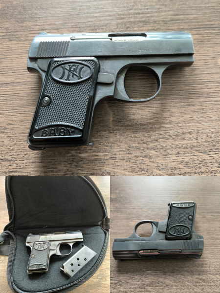Zum Verkauf steht eine kompakte Pistole im Kaliber 6,35 mm Browning aus dem Hause FN (Fabrique Nationale), Modell WTP (Westentaschenpistole). Es handelt sich um eine klassische Taschenpistole in hochwertiger Verarbeitung mit typischen FN-Griffschalen, die das bekannte FN-Logo sowie die Bezeichnung „BABY“ tragen. Die Waffe befindet sich in einem guten, gepflegten Zustand mit altersüblichen Gebrauchsspuren, die auf den Bildern gut erkennbar sind. Die Mechanik wirkt sauber und vollständig, der Lauf sowie das Patronenlager machen einen ordentlichen Eindruck. Im Lieferumfang enthalten ist ein passendes Magazin sowie ein praktisches Etui, wie abgebildet. Diese Pistole ist ein interessantes Sammlerstück und zugleich ein Stück europäischer Waffengeschichte, ideal für Liebhaber klassischer Taschenpistolen oder FN-Sammler. Verkauf erfolgt nur an Erwerbsberechtigte unter Beachtung der gesetzlichen Bestimmungen.