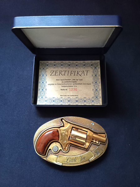 Verkaufe die Jubiläumsausgabe des Signal-Revolvers "Little Joe Gold" von RÖHM, die 23,5 k vergoldete Ausführung.