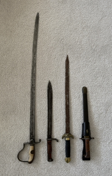 Konvolut historischer Blankwaffen – Säbel, Schwert und 2 Bajonette