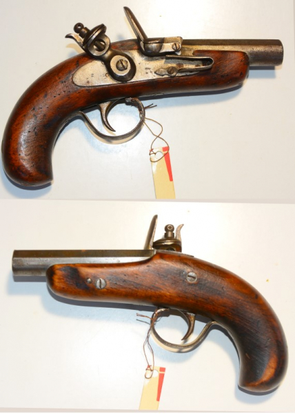 Reisepistole, Steinschloss, Lauflänge 10,1 cm, Gesamtlänge 20,3 cm, Kaliber 10 mm, wohl älter aber möglicherweise ein Historismusstück, funktionsfähig, keine Marken aber sicher französisch