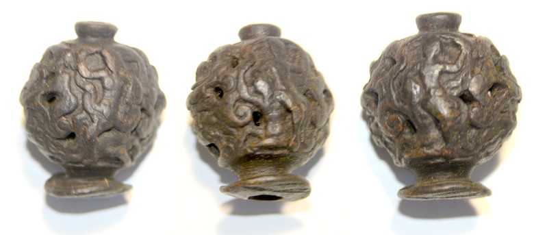 Original Knauf von Degen des 18. Jahrhunderts. Messing mit figürlichen Darstellungen. Höhe 39mm, Breite 34/27mm, Messing altersbedingt mit dunkler Patina