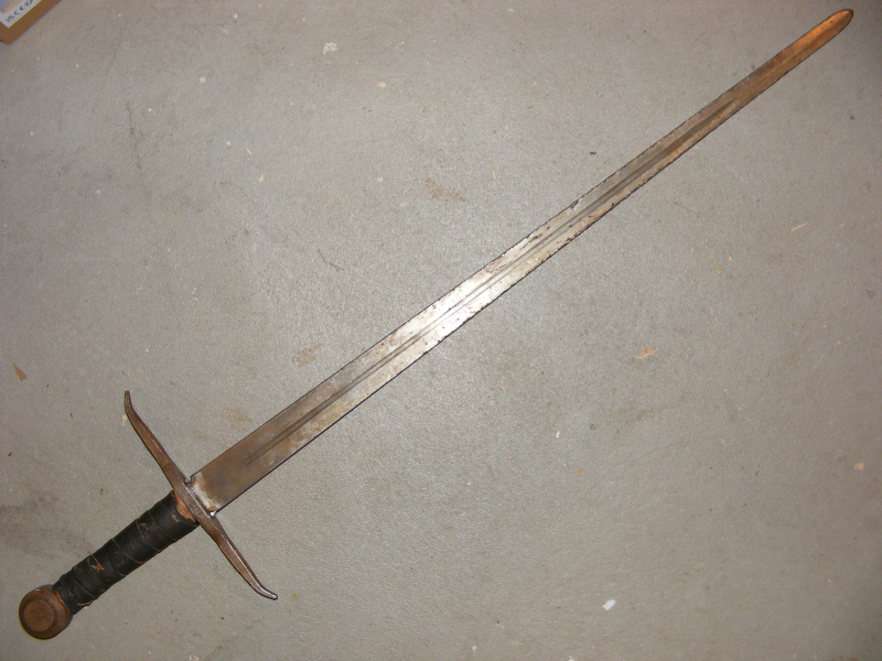 Schaukampfschwert, Ges. L.: 104 cm, Kl. L.: 81,5 cm, Kl. Br.: 43 mm. Eineinhalbhänder, hat augenscheinlich schon einige Kämpfe "erfolgreich" bestritten !!
