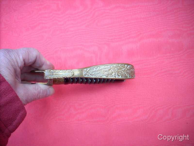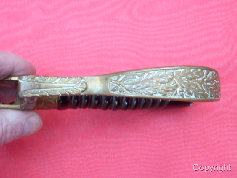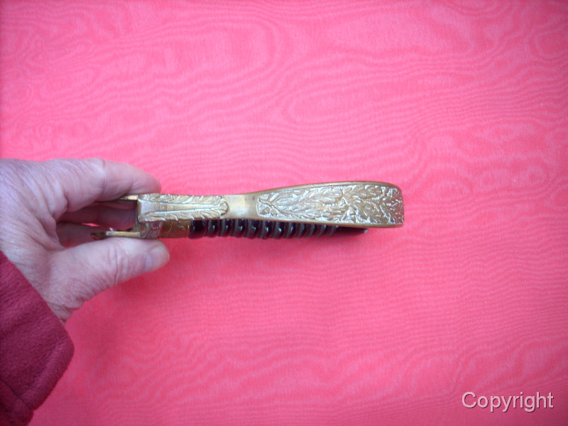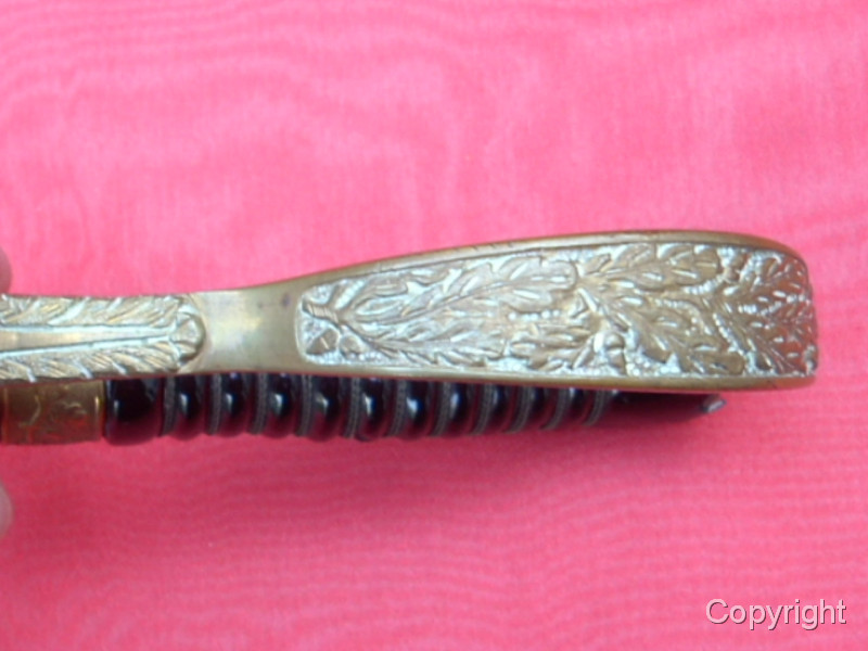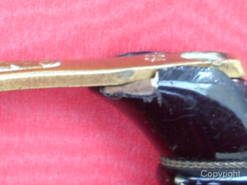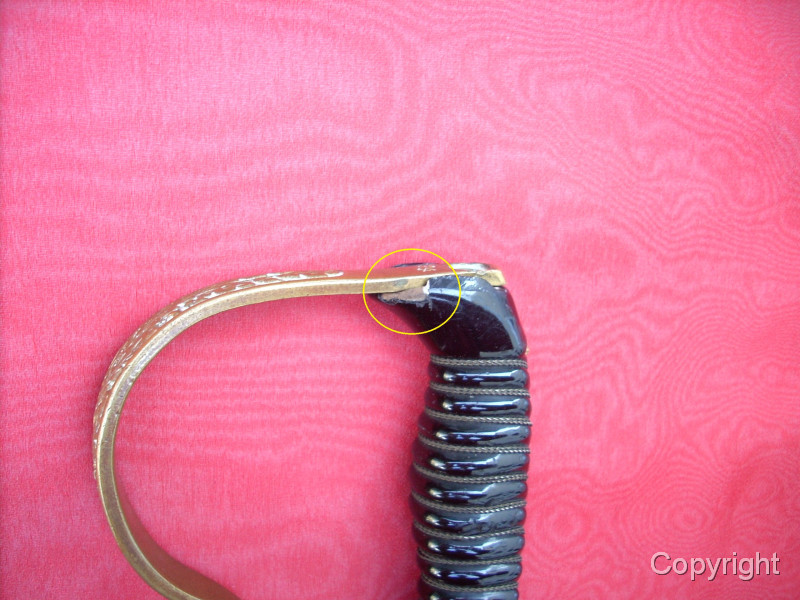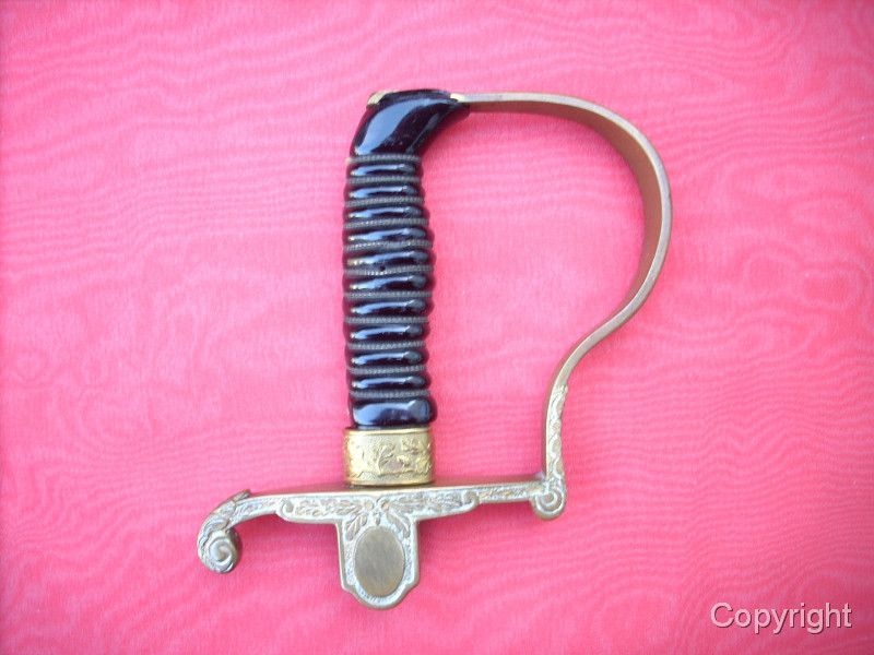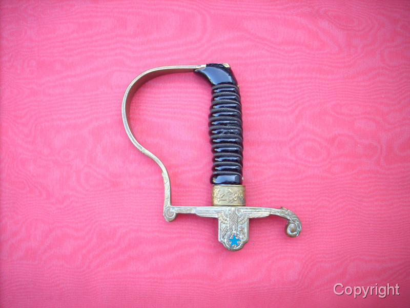 Griffmontur für einen Heeressäbel,. Griffstück mit Holzkern und intakter 2-fach Wicklung, diese gehalten von kleinen Holzstiften, wie es sein soll. Metallteile massives Buntmetall. Das Stück wurde nur oberflächlich, also nicht fachmännisch entnazifiziert. Das Hakenkreuz kann also mit etwas Geschick wieder hergestellt / renafiziert werden. Zustand siehe Fotos, die, wie immer, Bestandteil der Artikelbeschreibung sind. Keine Garantie und keine Rücknahme.