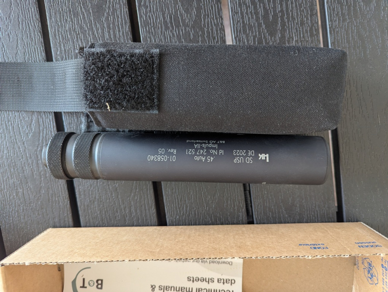 Nach fast abgeschlossener Geschäftsauflösung , kommen nun die letzten Schmankerl zur Auktion . Hier wird ein originaler, unbenutzter Kurzwaffenschalldämpfer von Brügger & Thomet für die Pistole MK 23 von H&K im Kaliber .45 ACP angeboten . Er wurde ursprünglich für einen " Stadtjäger " beschafft , jedoch hat ihm dann sein zuständiges Amt im letzten Moment doch die Sondergenehmigung verwehrt . Dieser Schalldämpfer in Verbindung mit der Patrone .45 ACP ist natürlich das absolute Zusammenspiel von Kraft und Leistung , denn die Daten von einer Vo unter 320 m/s , bei einem Geschoßgewicht zwischen 11 - 16,0 Gramm und einem Querschnitt von ca. 11,3 mm und dazu dann noch in der Geschoßvariante eines Hohlspitzgeschosses , sind der absolute Hammer zur Verwendung als nahezu lautlose Fangschußpatrone im urbanen wie befriedeten Bereich auf krankes oder wehrhaftes Wild . Der Dämpfer hat bei einem Gewicht von 370 Gramm , einem Durchmesser von 35 mm und einer Gesamtlänge von 190 mm , immer noch händelbare Eigenschaften . Versehen ist der SD mit dem Originalgewinde der H&K von M16x1 ( links). Zum Erwerb ist hier allerdings die vorherige Genehmigung der zuständigen Behörde in der WBK erforderlich . Bei Kurzwaffenschalldämpfern gibt es leider keine andere Option . Möglich ist jedoch auch eine WHL oder eine Zertifizierung als Waffensammler oder Sachverständiger ! Der derzeitige Neupreis liegt bei 998,-€ . Rücknahme oder Umtausch sind ausgeschlossen !