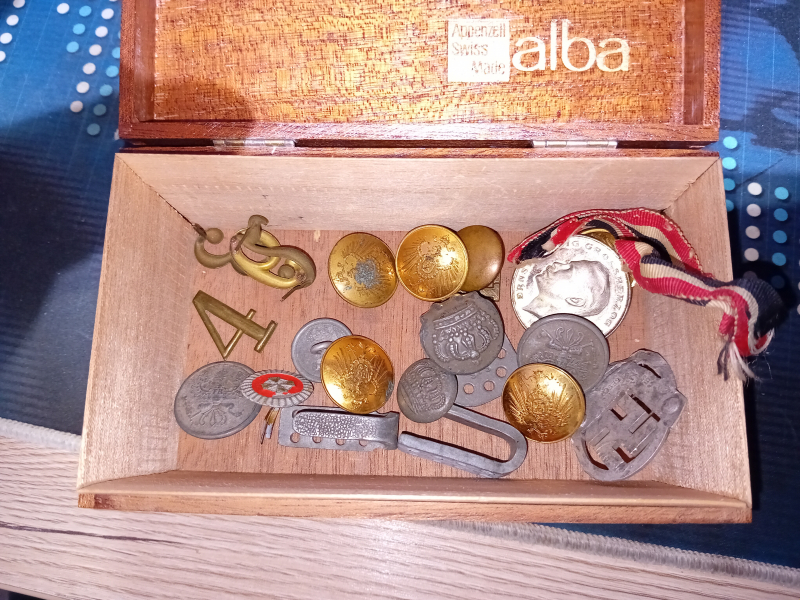 aus Nachlass eine Zigarrenkiste mit Uniformteilen wie Knöpfe, Nummern, Medallie ...