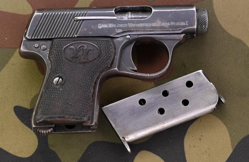 Auf Schlitten rechts Herstellerangabe "Waffenfabrik Walther Zella-Mehlis I" und gültiges altes Beschusszeichen Krone über N. Letzteres auch auf Lauf und Griffstück rechts. "SELBSTLADE-PISTOLE CAL. 6,35. WALTHER`S PATENT" und Walther-Schleife links auf dem Schlitten. Links auf dem Griffstück Seriennummer. Schwarze Kunststoffgriffschalen geprägt "CW" (= Carl Walther), mit leichten Gebrauchsspuren. Beidseits der Sicherung "S" bzw. "F".