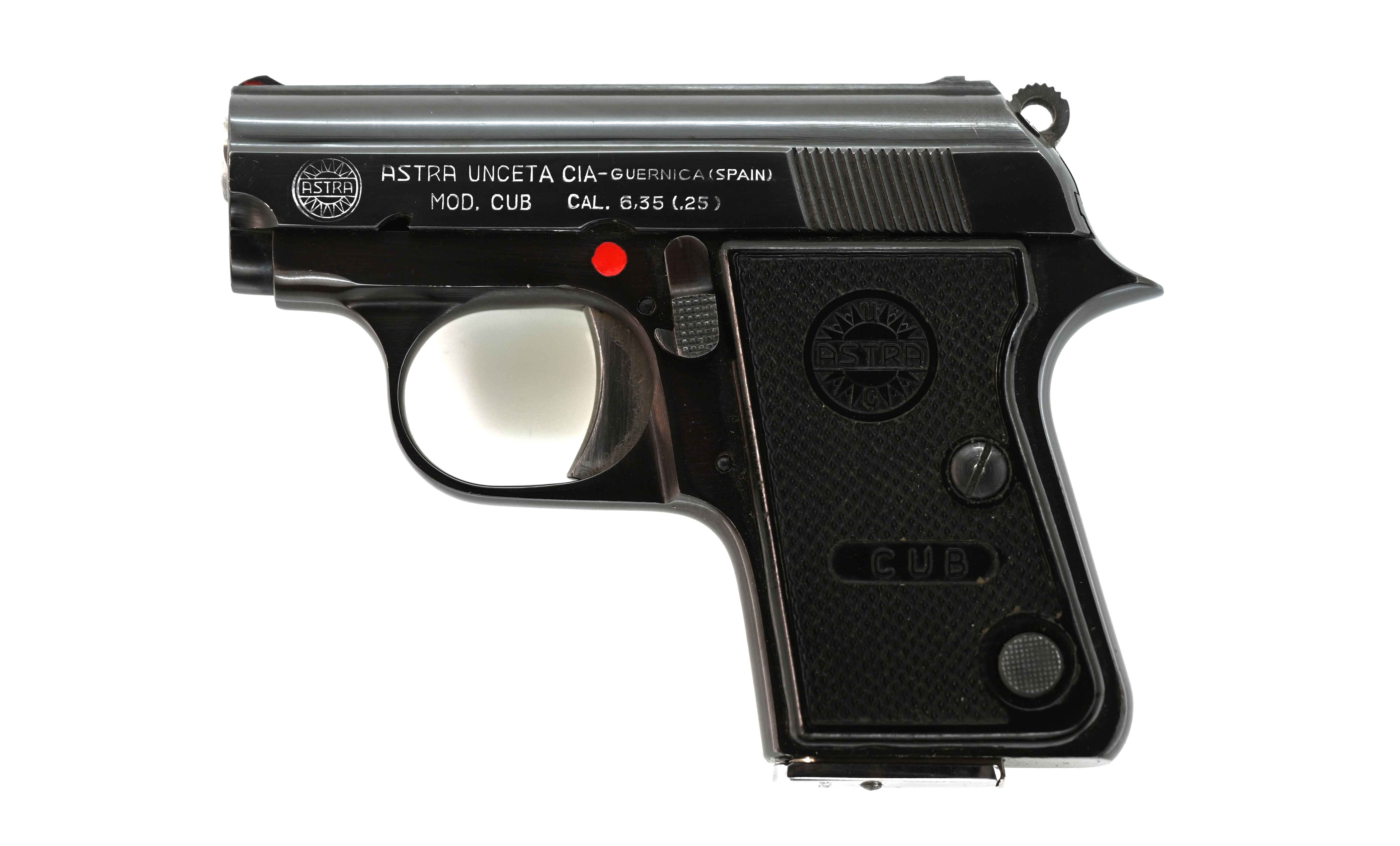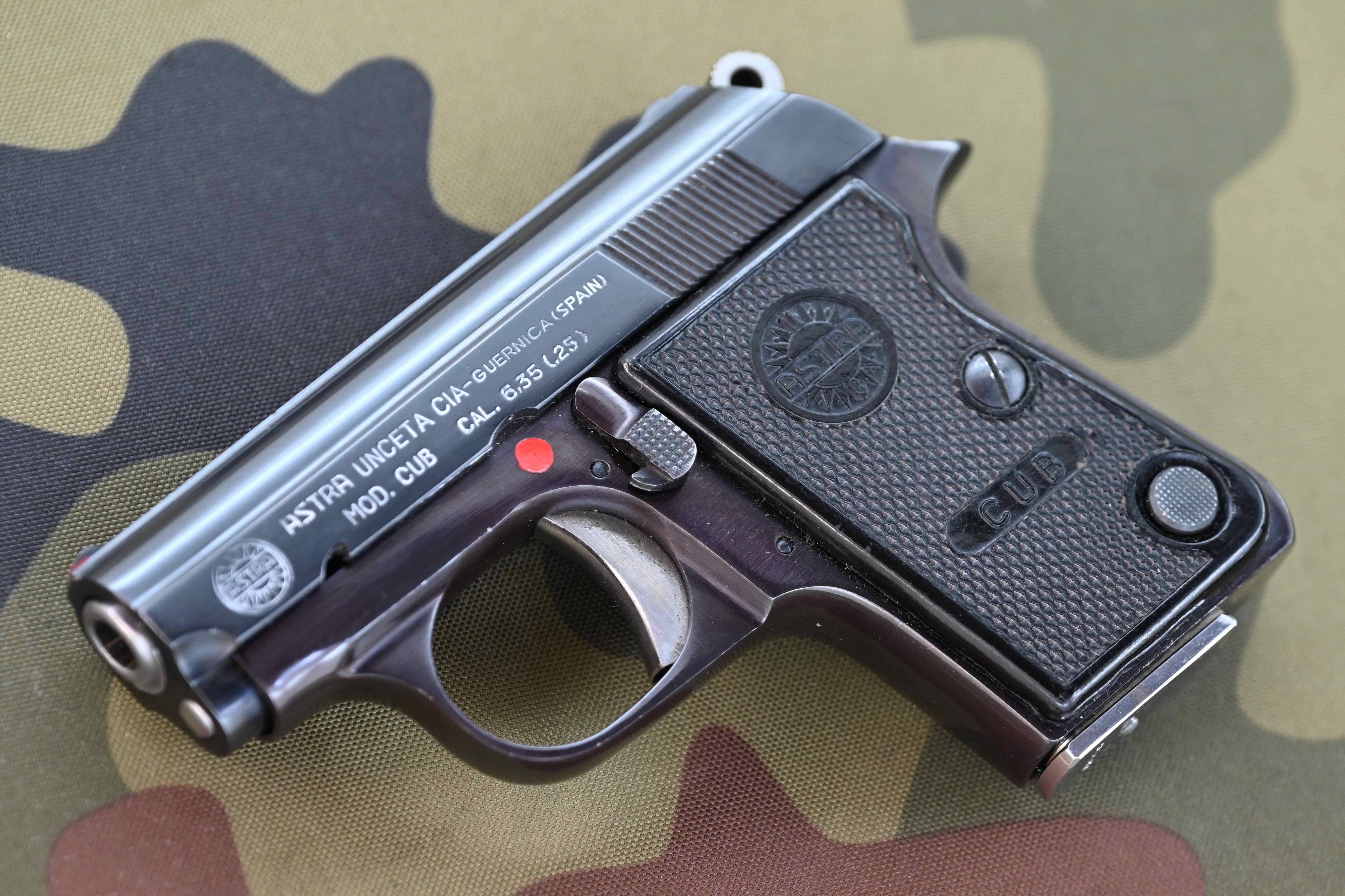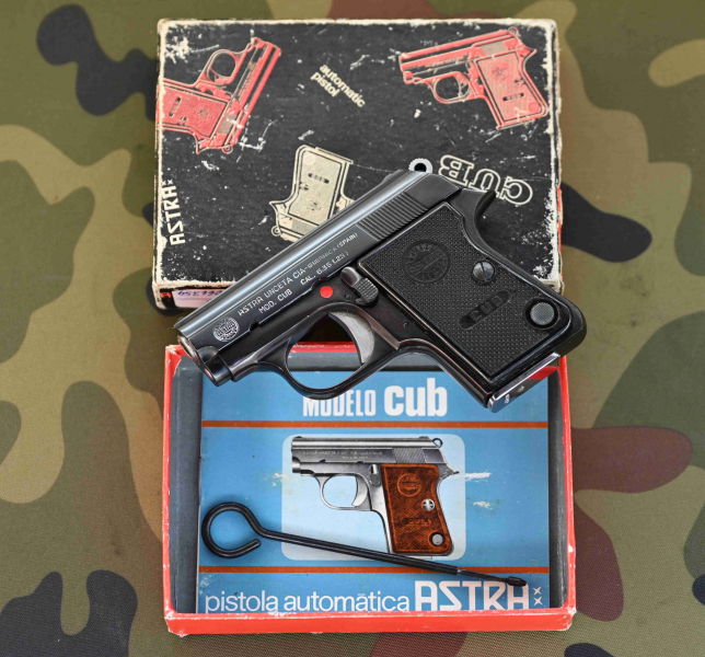 Kaliberangabe "CAL. 6,35 (.25)“ auf dem Schlitten links, gültiger spanischer Beschuss, Hersteller „ASTRA Unceta CIA-Guernica - SPAIN", diverse gültige spanische Beschusszeichen "P" auf dem Rahmen, unter der linken Griffschale, codiert-datiert "R*1" = 1973. Seriennummer "1286716". Kreisrundes Firmenlogo "ASTRA" und Modellbezeichnung "CUB" auf beiden Griffschalen. Magazinboden geprägt "ASTRA".
