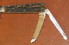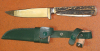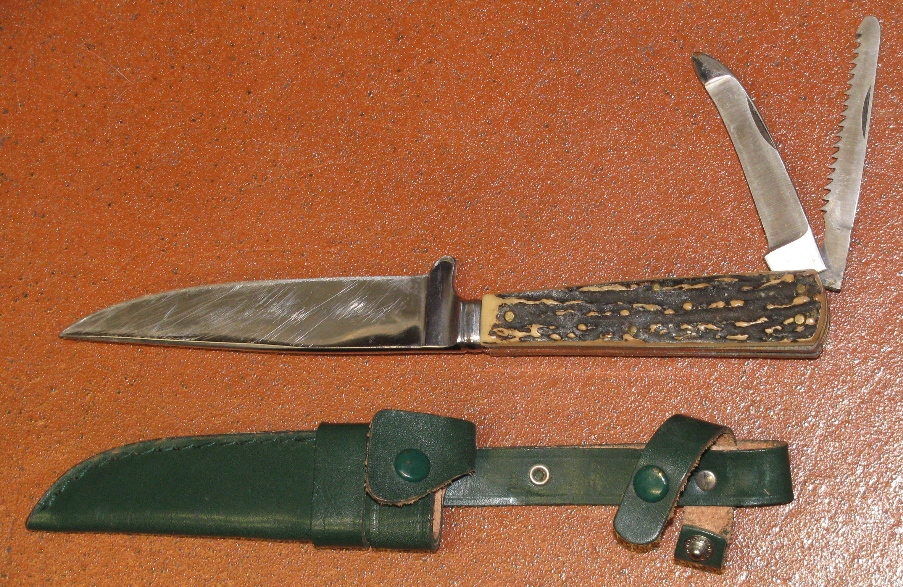 Zum Verkauf kommt ein Interessantes Jagdmesser mit Werkzeug im Griff und Horngriffschalen / Lederscheide