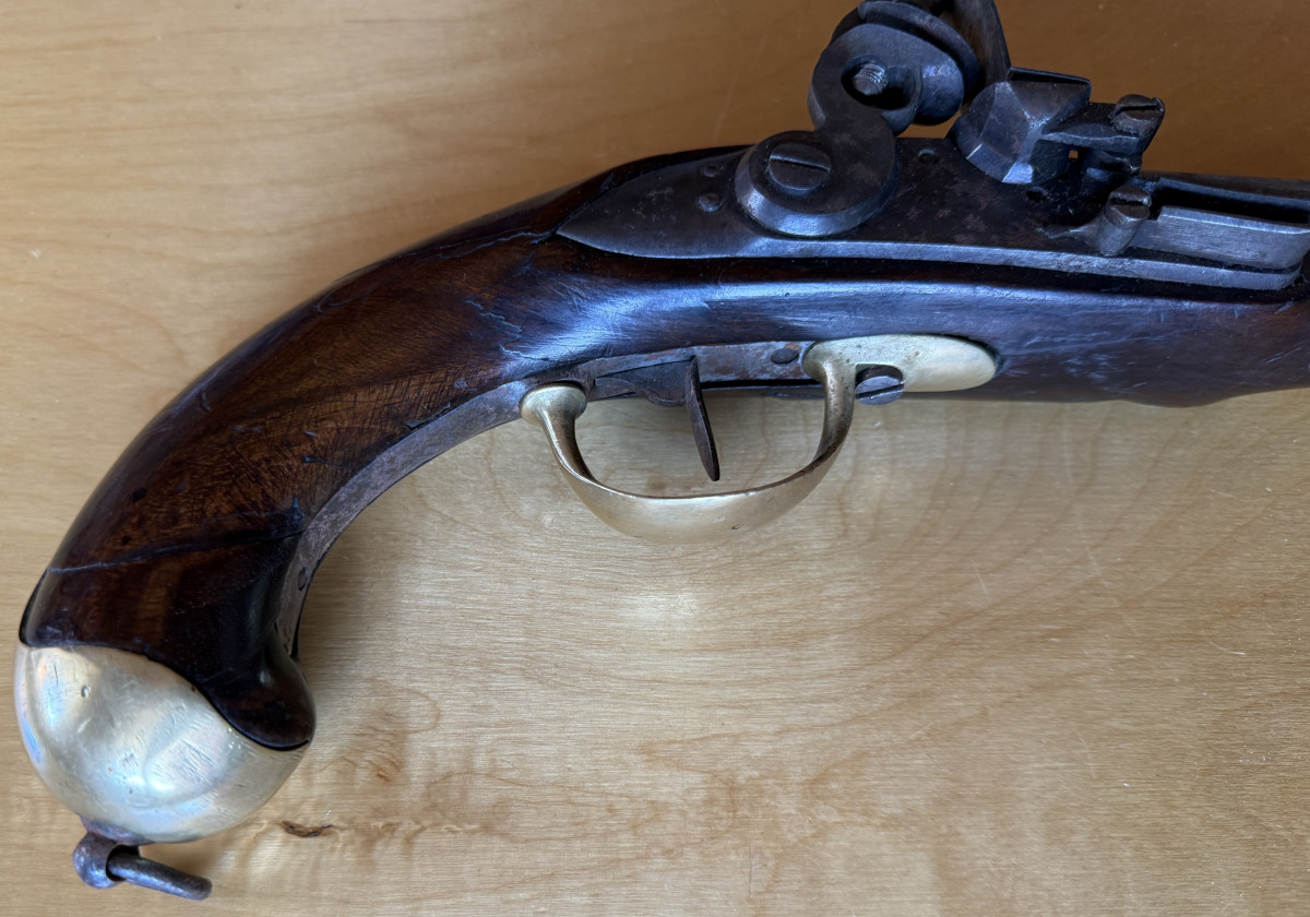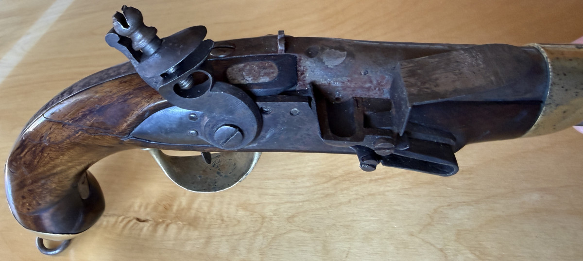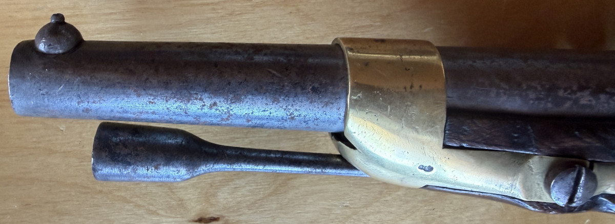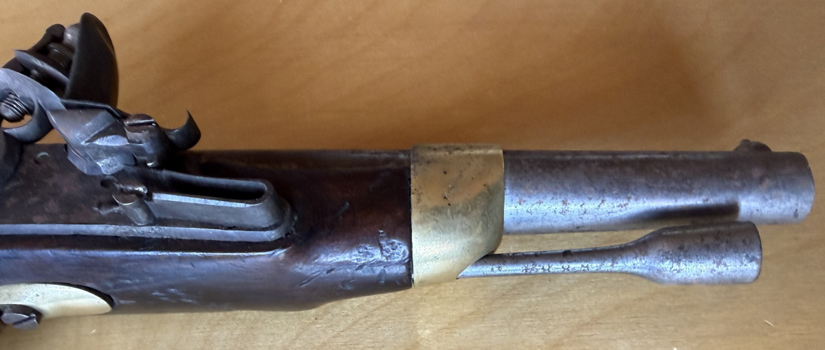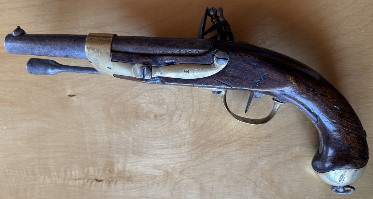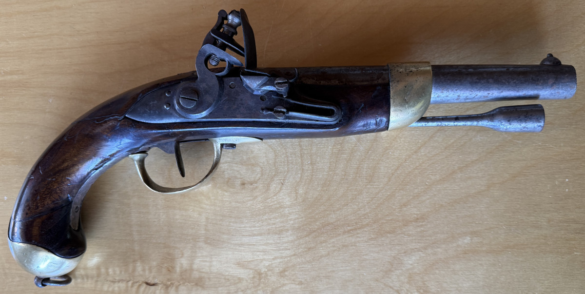 Das ist eine französische M An XIII Pistole mit Steinschloss für die Kavallerie. Also Modell 1813. Ab 1822 gab es dann eine neue M An 1822 Pistole mit dem ersten Perkussionsschloss und einem andren Laufring vorne, Diese hier wurde nach 1822 nur teilweise modernisiert mit einem Laufring den man nicht mehr verlieren konnte, weil jetzt angeschraubt. Normal wurde dann das Steinschloss auf Perkussion mitgeändert. Das ist hier nicht passiert.