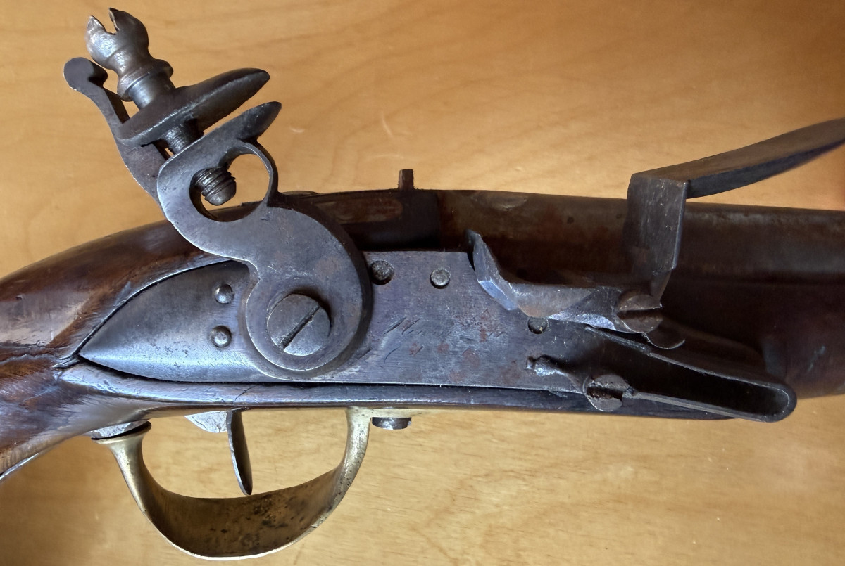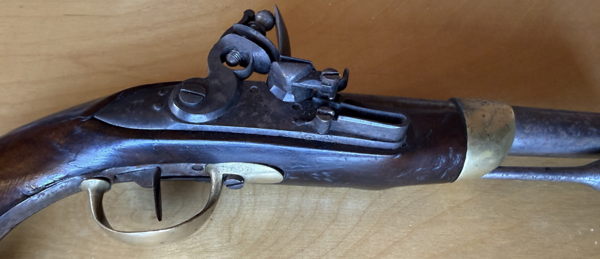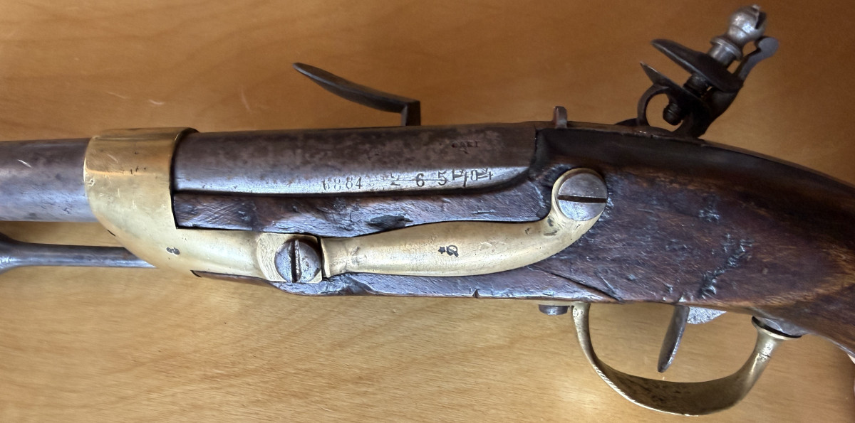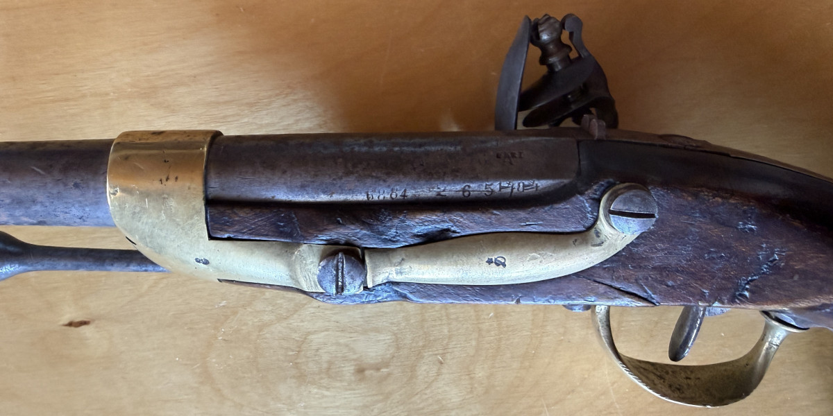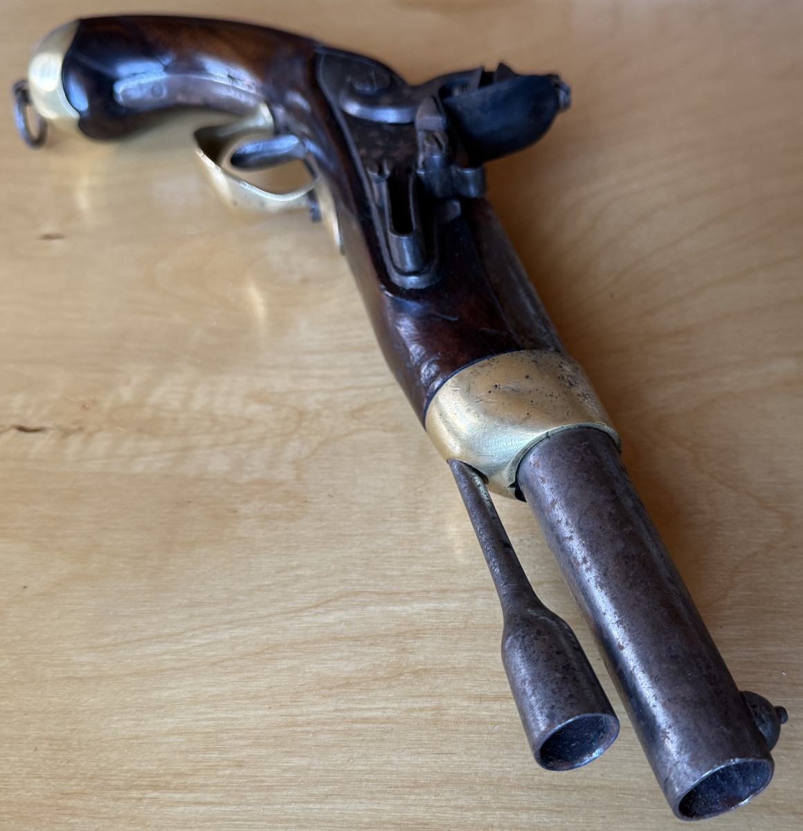 Das ist eine französische M An XIII Pistole mit Steinschloss für die Kavallerie. Also Modell 1813. Ab 1822 gab es dann eine neue M An 1822 Pistole mit dem ersten Perkussionsschloss und einem andren Laufring vorne, Diese hier wurde nach 1822 nur teilweise modernisiert mit einem Laufring den man nicht mehr verlieren konnte, weil jetzt angeschraubt. Normal wurde dann das Steinschloss auf Perkussion mitgeändert. Das ist hier nicht passiert.