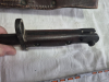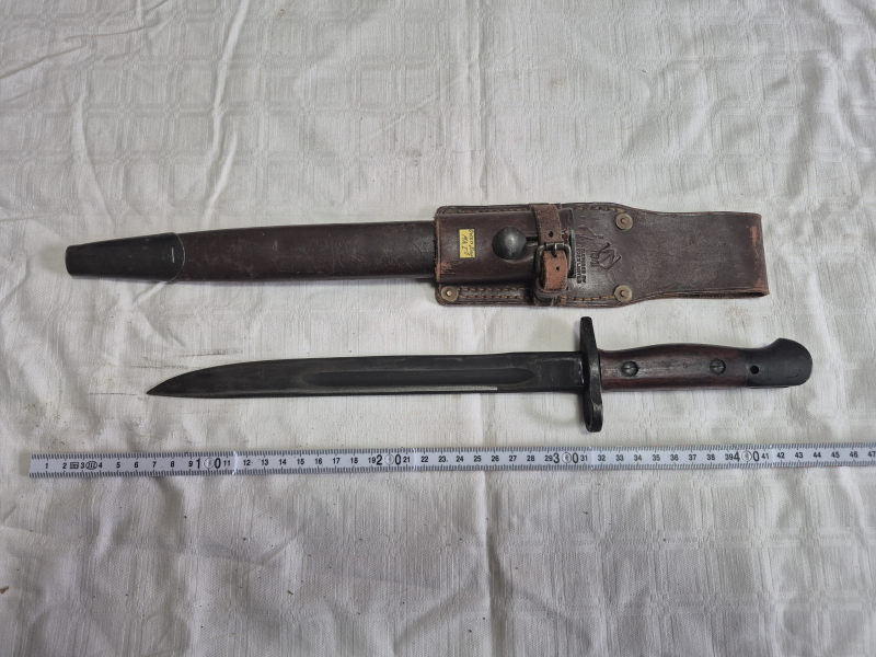Verkaufe, aus dem Nachlass meines Vaters, Bajonett MK1 Owen B. (kann nicht mehr entziffern). Vermute England, bin für Hinweise dankbar. Auf dem Koppelschuh steht Johannesburg und auf der Lederscheide Mangrovite und event. eine 14. Zustand siehe Bilder, Drücker funktioniert.