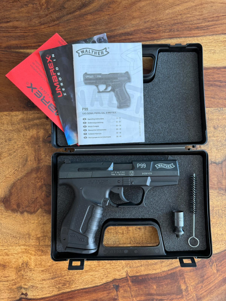 Walther P99 Schreckschuss-/Reizstoff-/Signalpistole – sehr guter Zustand || Ich biete hier eine Schreckschuss-, Reizstoff- und Signalpistole Walther P99 zum Verkauf an. Die Pistole wurde vor einigen Jahren lediglich einmal an Silvester zum Abschießen von Feuerwerkskörpern genutzt. Anschließend wurde sie gründlich gereinigt und seitdem nicht mehr verwendet. Dementsprechend befindet sich die Waffe in einem sehr guten Gesamtzustand mit lediglich minimalen Gebrauchsspuren (siehe Bild). Details: Modell: Walther P99 - Gas-Signal Pistol Cal. 9 MM P.A.K. Zustand: sehr gut, technisch einwandfrei | Nutzung: nur einmal verwendet || Lieferumfang: Walther P99 Schreckschusspistole | Reinigungsbürste | Aufsatz für Signalmunition / Feuerwerkskörper | Original Bedienungsanleitung | Original gepolsterter Walther Hartschalenkoffer || Versand: Der Versand ist deutschlandweit für 8,99 € möglich. Dieser erfolgt ausschließlich mit Altersprüfung (18+). Bei Interesse kann ich gerne weitere Bilder zur Verfügung stellen. Privatverkauf – keine Garantie, Gewährleistung oder Rücknahme.
