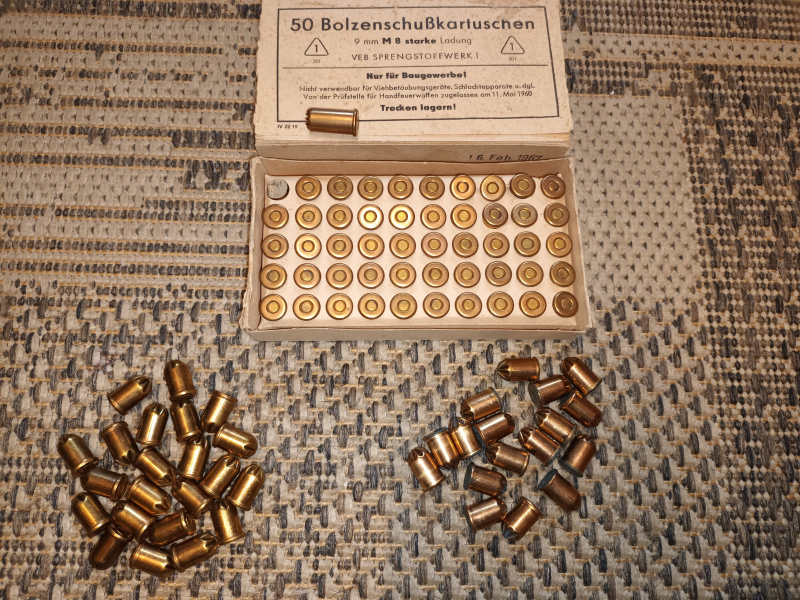 Biete eine Schachtel mit 50 alten DDR Bolzenschusskartuschen 9 mm M8 und zwei Reste 9x17 mm Rand Knallpatronen. Das sind 18 x PTS ? korrodiert aber funktionsfähig und 22 x SP 9 mm. Alles alte Kartuschen ohne Garantien.