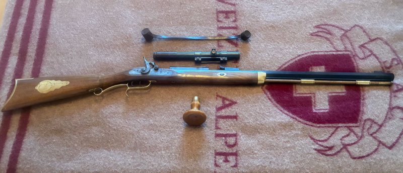 Sehr schöne Dinar Hawken-Rifle im Cal. 45 mit Zieloptik und abschraubbarem Pilz.