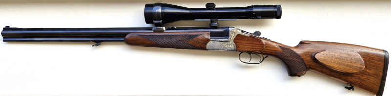 Sie bieten auf eine Bockbüchsflinte von der Firma Wilhelm Heym, Modell 55 im exzellenten Zustand. Die Kaliber sind 7x65R und 12/70. Die Waffe stammt lt. Beschuss von 1985, wurde aber anscheinend nur angeschafft und nicht geführt. Es sind so gut wie keine Gebrauchsspuren zu finden. Brünierung, Basküle und Schaft sind im sehr guten Zustand. Die Lauflänge beträgt 63,5cm, die Schaftlänge ca. 35cm. Der schöne Nussbaumschaft hat eine deutsche Backe, die Fischhaut ist scharfkantig. Auf der Basküle befindet sich auf der linken Seite Hirsch, die rechte Seite zeigt einen Fuchs, beide Seiten sind zusätzlich mit Abaresken verziert, ebenso der Abzugsbügel aus Stahl. Die BBF verfügt über einen Kerstenverschluss und ist somit sehr stabil. Der vordere Abzug für den Kugellauf kann eingestochen werden. Das Zielfernrohr ist ein Zeiss Diavari-Z 2,5-10x52 mit Abs. 1. Der Durchblick ist sauber und klar. Montiert ist eine Schwenkmontage, somit lässt sich bei Bedarf leicht ein weiteres Zielfernrohr montieren. Eine tolle Waffe, die in diesem Zustand nur noch selten zu finden ist. Perfekt für Liebhaber von Heym Waffen, Sammler oder die eine kombinierte Waffe von hoher Qualität suchen. EWB erforderlich, internationaler Versand nur durch einen zu benennenden deutschen Händler.