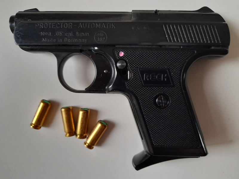 Kein Schießbecher im Lieferumfang, aber vier 8mm Platzpatronen.