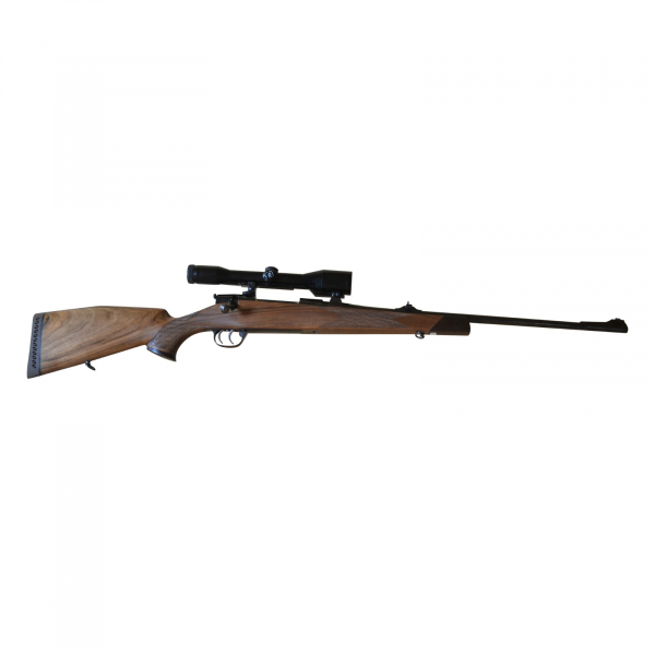 Nussbaumholz- Schaft, die Tiroler Schaftbacke wurde vom Schäfter entfernt, gummierte Schaftkappe, Monte Carlo Backe, Fischhautverschnitt an Griff & Vorderschaft, Griffkolbenkappe Schaftnase abgesetzt mit Edelholz, Riemenbügel