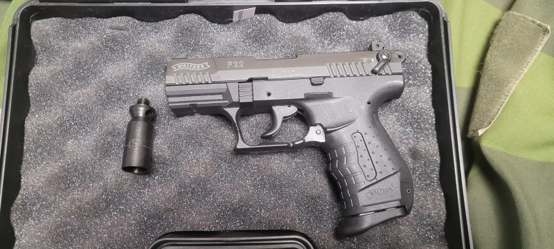 Hier meine Walther P22 9mm PAK, wenig genutzt, nur dann und wann bei der abendlichen Spaziergang mal einstecken gehabt. Funktion getestet und einwandfrei. Lieferung im originalen Koffer mit Abschussbecher.
