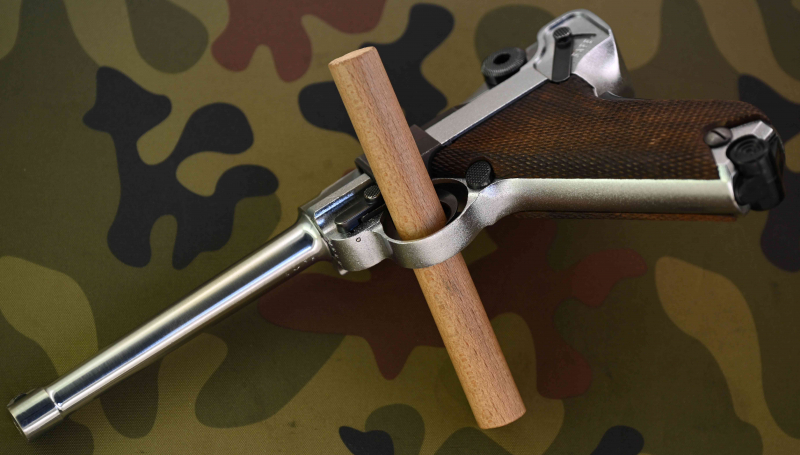 Seriennummer "3330", Hinweis „Original Mauser“ mit Mauser-Tonne aufder Oberseie des Kniegelenkverschlusses. Auf der Unterseite der Laufwurzel Kaliberangabe "9x19". Gültige bundesrepublikanische Beschusszeichen, rechts auf dem Patronenlager datiert "8 01" = August 2001. Rechts von der Drehsicherung auf dem Griffstück "SAFE".