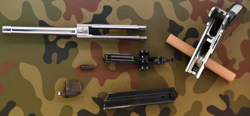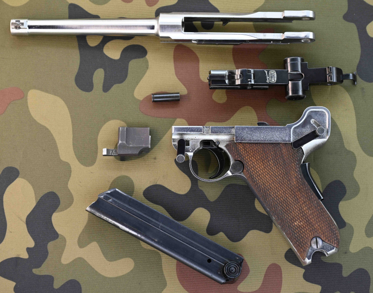 Verschluß, Deckplatte, Riegel, Schrauben, Magazin, Abzug und Magazinentriegelung schwarz brüniert, tiptop, Restwaffe im Stainless-Look, an den Seiten leicht gesandelt-matt ausschauend, obere Flächen blank poliert.